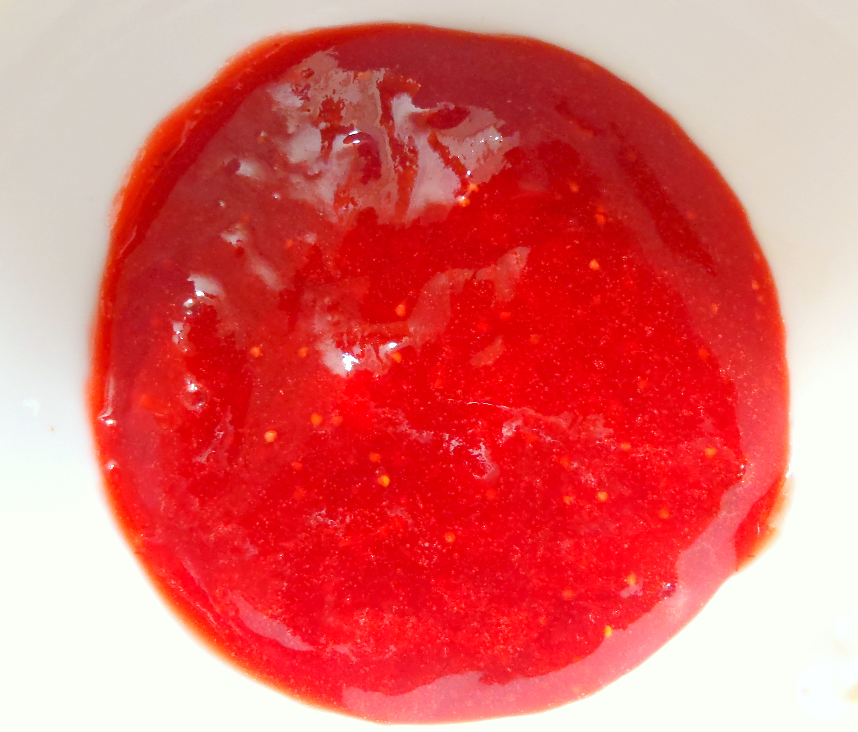 Tagliate le fragole in pezzi grossi ( tenetene una decina da parte, le più piccole) e schiacciatele con una forchetta o passatele  nel passa verdure con fori grandi , mettetele a sgocciolare  in un colino  raccogliendo  il succo in una ciotola;