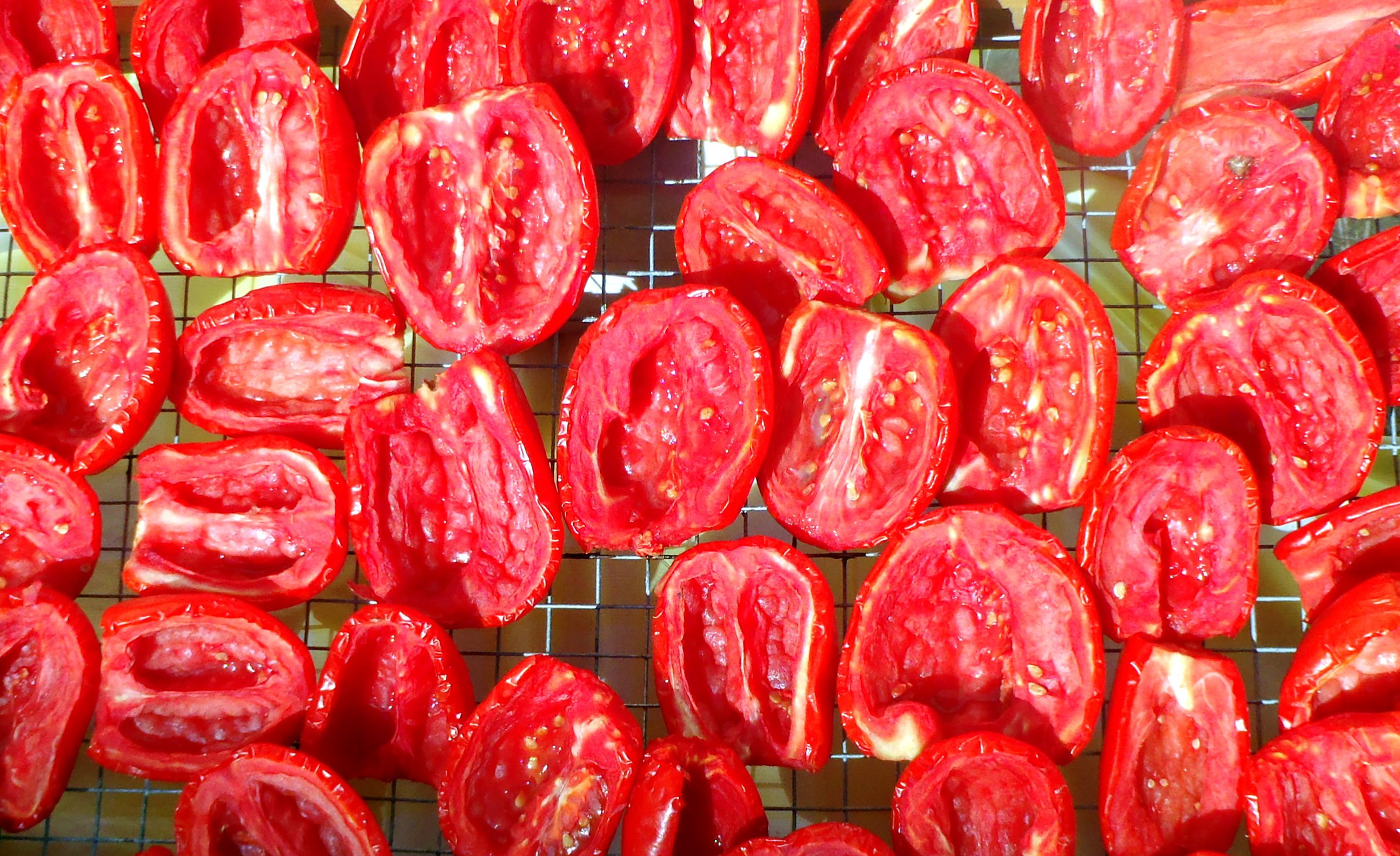 Spaccare i pomodori in due parti e stenderli sopra una tavola di legno, togliere i semi se sono molti altrimenti schiacciarli con un dito o una forchetta, salare leggermente e metterli in pieno sole a essiccare per 1 settimana o più secondo la grandezza del pomodoro e il tempo soleggiato o meno. Ritirare al coperto o al chiuso la sera. Se ci sono troppi insetti, meglio coprire con un  velo.