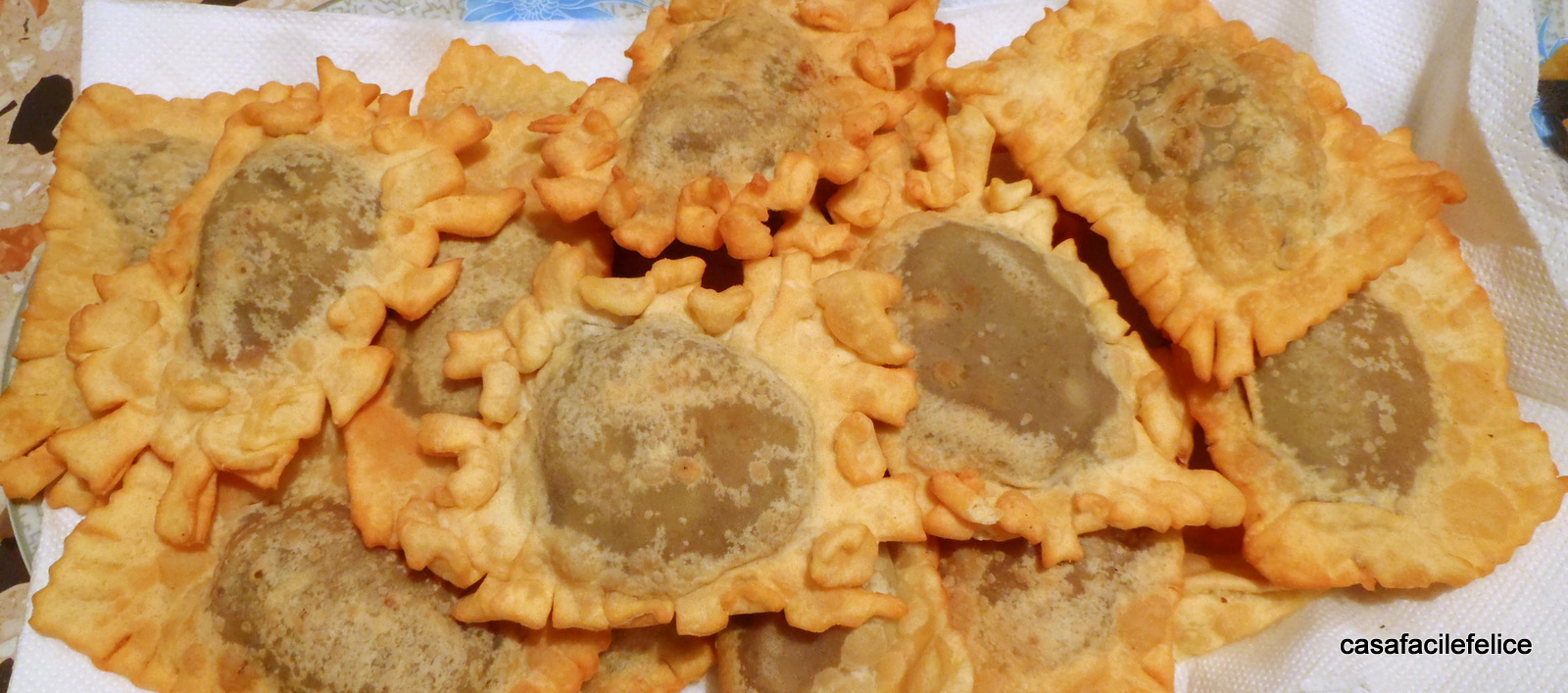 abbellite i calzoncelli premendo i rebbi di una forchetta sui lati o tutt’intorno (se avete usato il coppapasta), facendo attenzione a non bucare la pasta; un altro modo di rifinire i dolcetti, consiste nel fare tanti piccoli tagli sui margini e ripiegarli su se stessi alternativamente, facendo molta attenzione a non arrivare al ripieno (i dolcetti bucati, spargerebbero il ripieno nell’olio di cottura, rendendolo inutilizzabile).