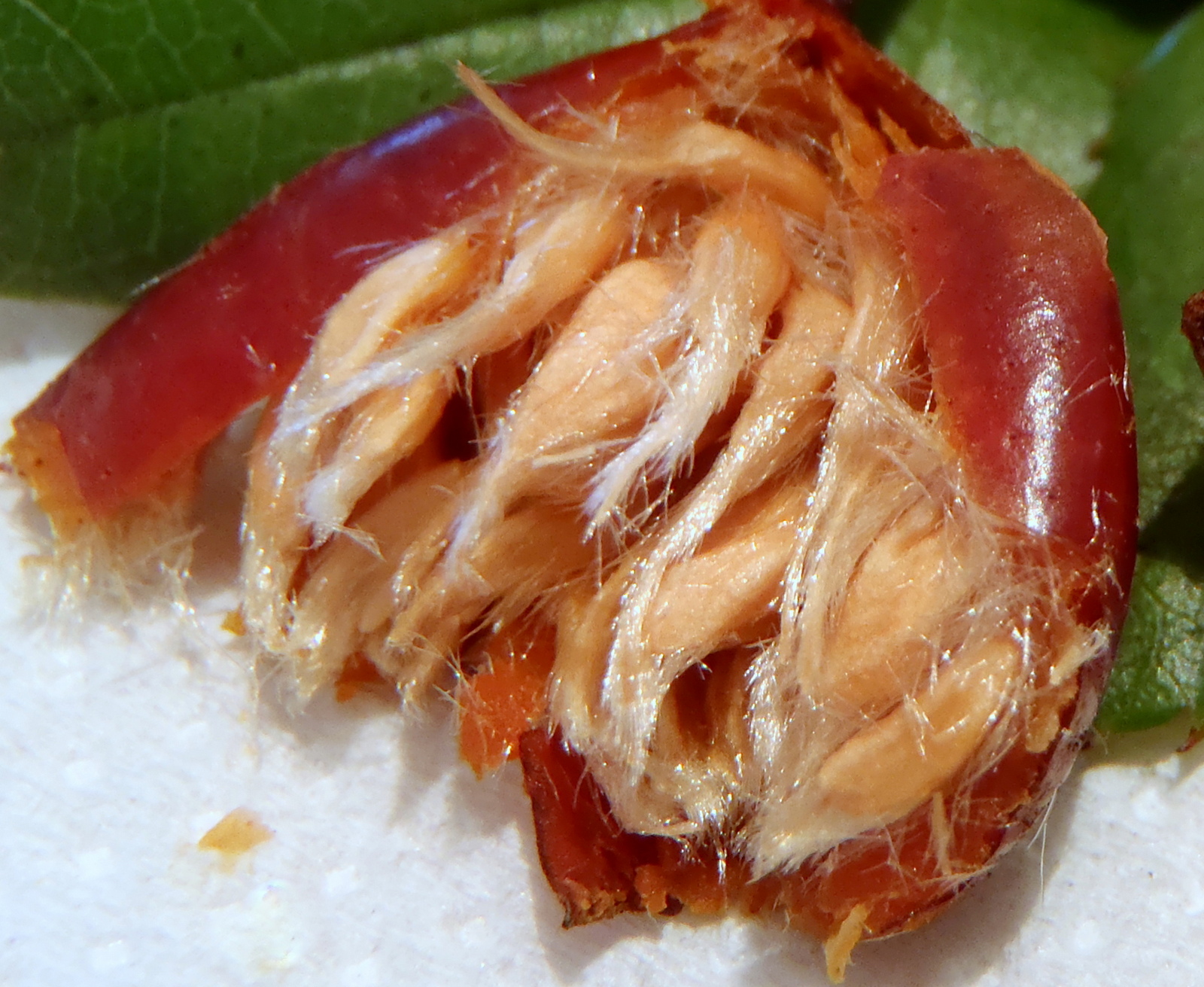 I frutti della pianta sono acheni pelosi racchiusi in un falso frutto, il cinorrodio, di colore rosso o rosso scuro quasi nero, molto duro che diventa morbido a fine inverno, il momento migliore per raccoglierli e utilizzarli.