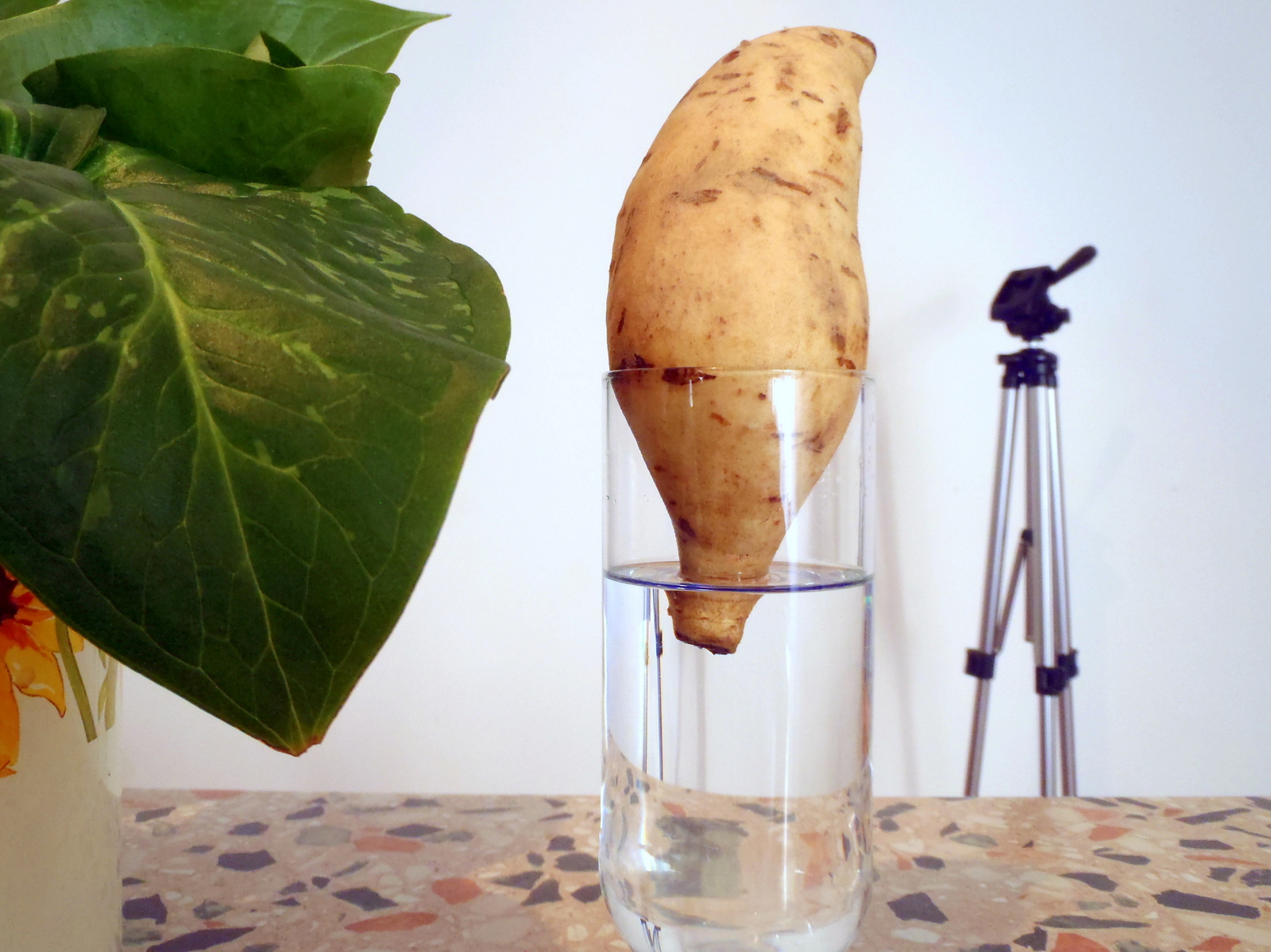 Una volta, in primavera, era usanza far germogliare le patate dolci nell’acqua; dopo poche settimane, i germogli facevano capolino e contemporaneamente, si sviluppavano le prime radichette. Se volete provarci, fate come mostrato in foto: