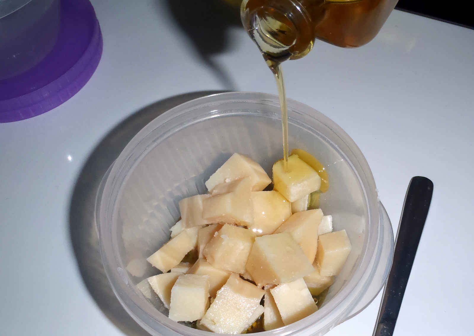 Mettete le spezie scelte nel contenitore e aggiungete il formaggio tagliato a pezzettini,