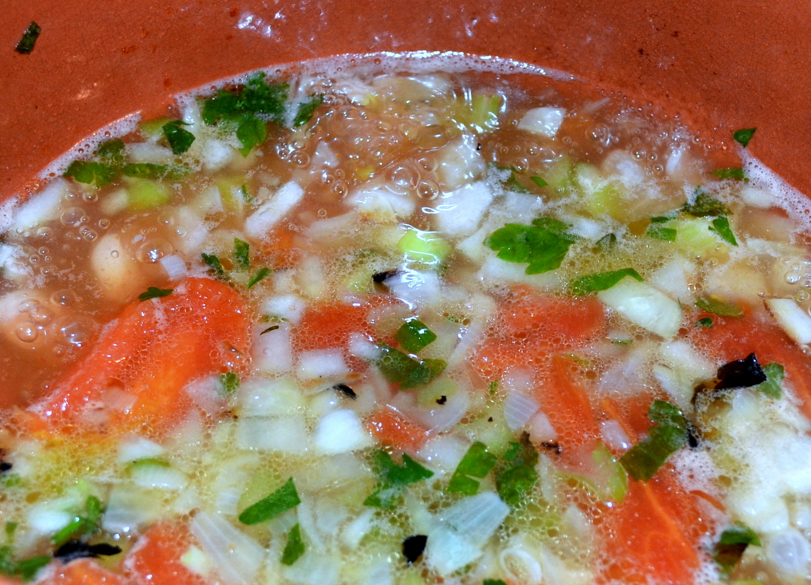 Tritate grossolanamente la cipollina e il sedano; quando sentite che si spande il profumo dell’aglio, aggiungete anche il trito di cipolla e sedano. Mescolate, fate insaporire giusto 1 minuto (non deve cuocere), aggiungete l’acqua di cottura dei fagioli, i filetti di pomodoro pelato e lasciate bollire per 15 minuti. Se non avete l’acqua di cottura dei fagioli, usate acqua calda nella quale avrete frullato 20 grammi di fagioli.