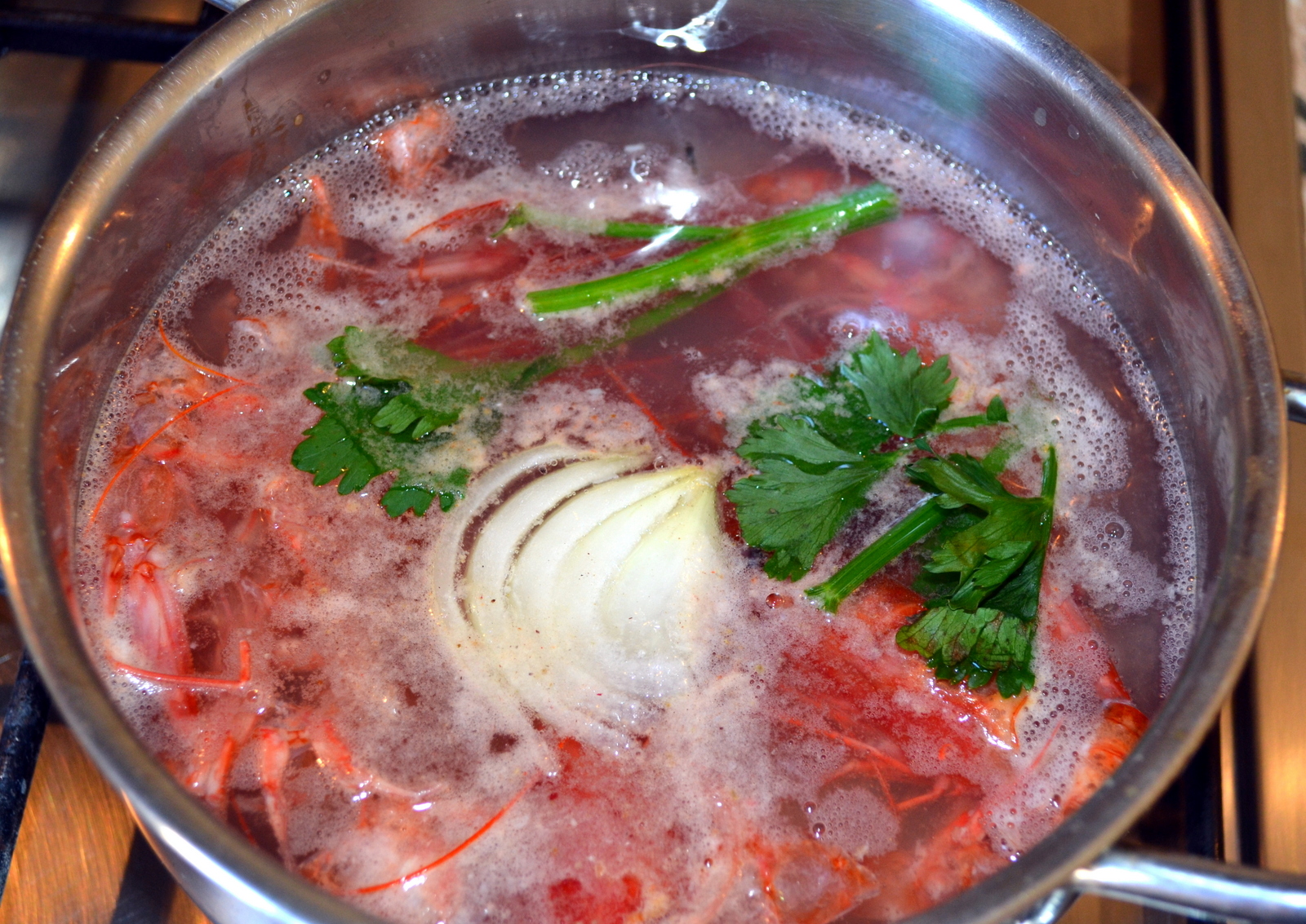 con gli scarti preparate il fumetto aggiungendo tutti gli  ingredienti ( escluso il sake e la salsa di soia) e fate bollire a fuoco lento;gamberoni rossi,ricette con riso,www.casafacilefelice.org,fumetto di pesce