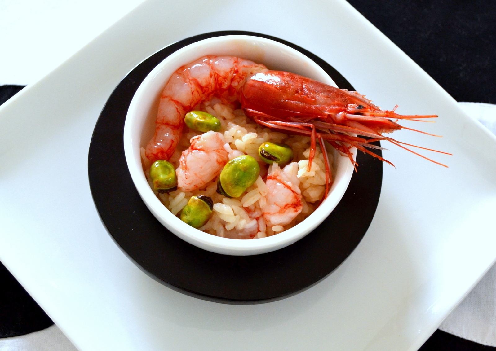 Trascorso il tempo, versate il riso nel piatto (o ciotola),  posizionate il gambero intero, disponete le fave e servite.gamberoni rossi,ricette con riso,www.casafacilefelice.org,fave