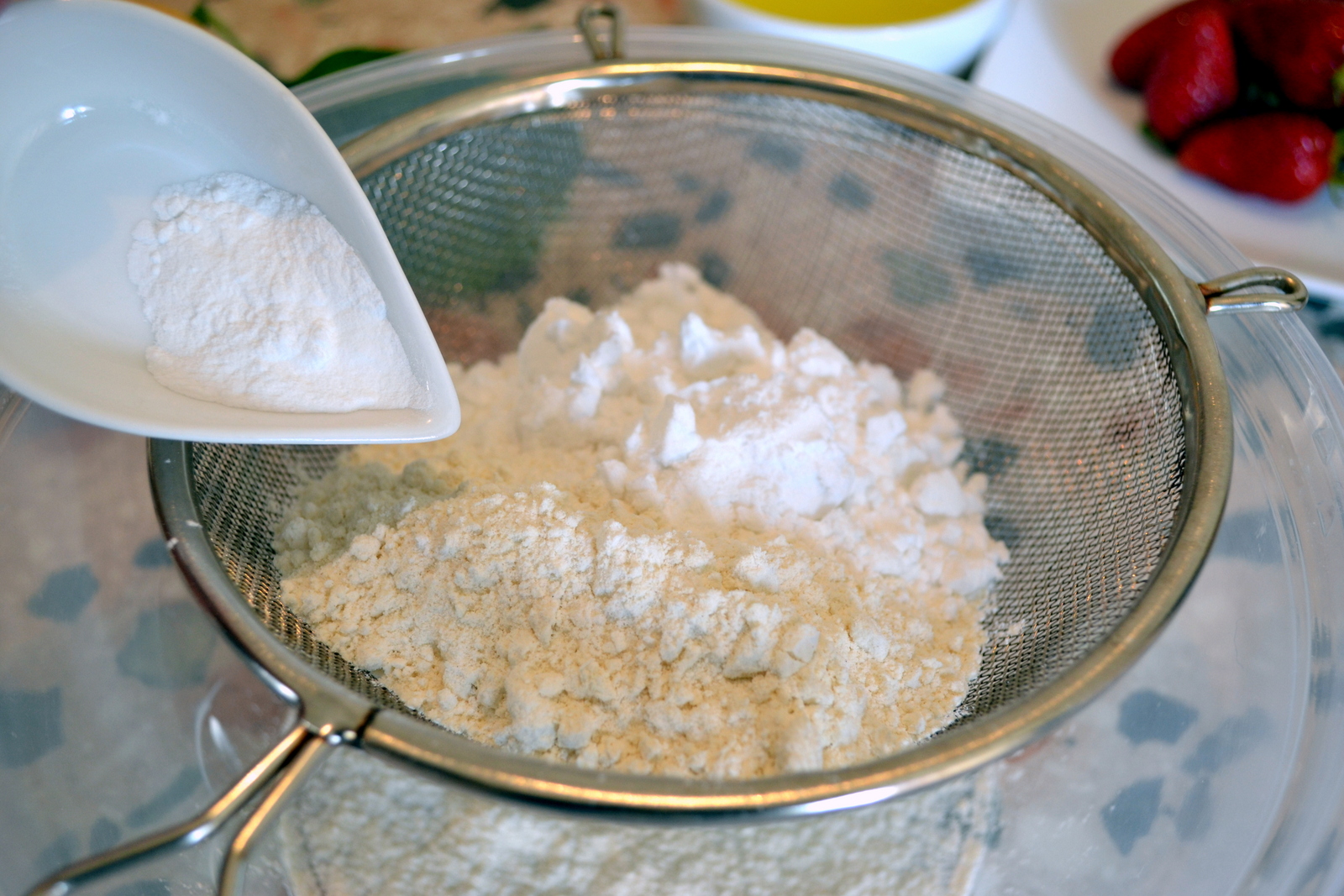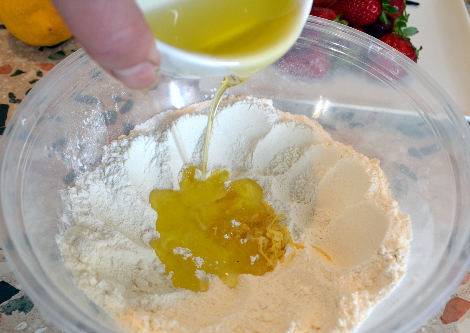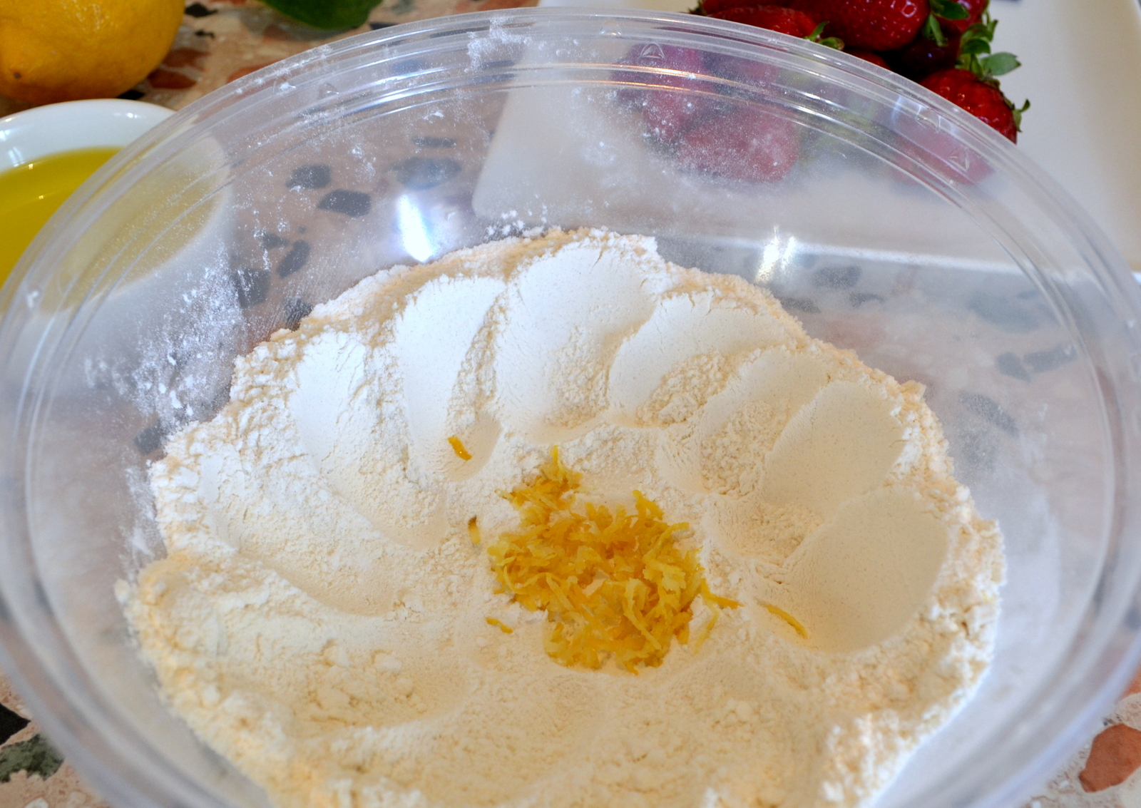 Sift in a bowl, flour and potato starch together with salt and baking powder; add sugar, grated lemon peel and stir together well.