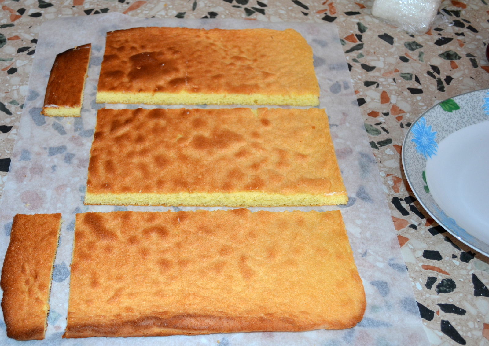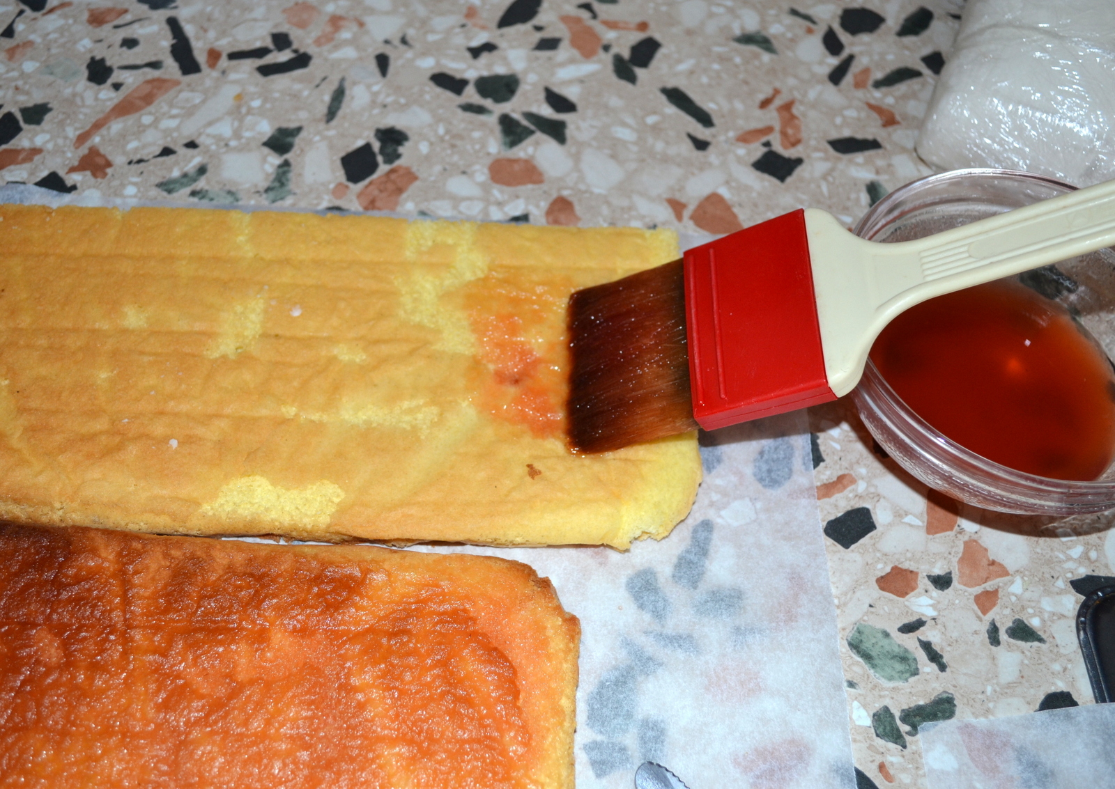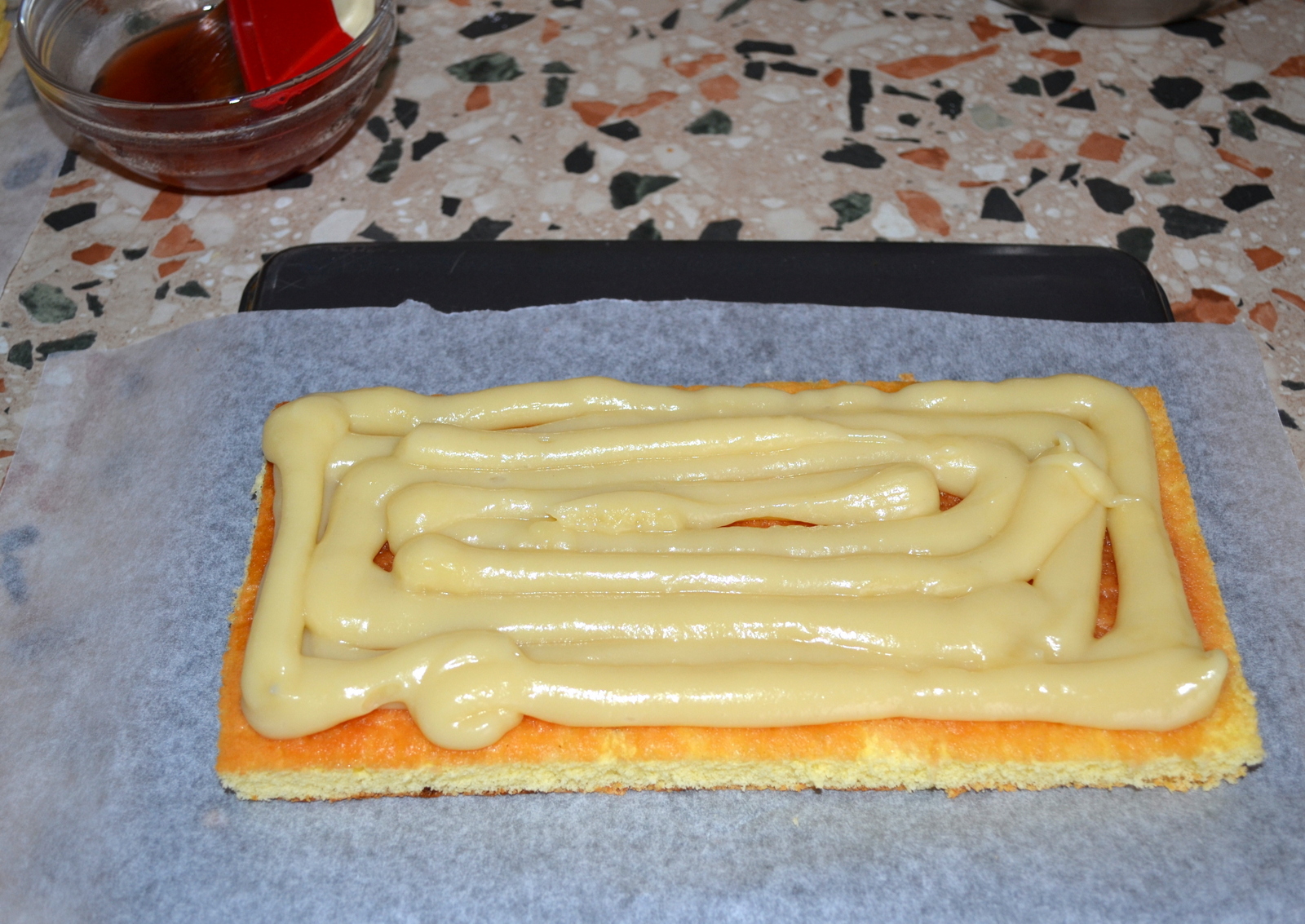 Preparate la pasta biscuit come descritto nella ricetta; quando è cotta, non arrotolatela  ma lasciatela raffreddare su una gratella,  quella del forno andrà bene.