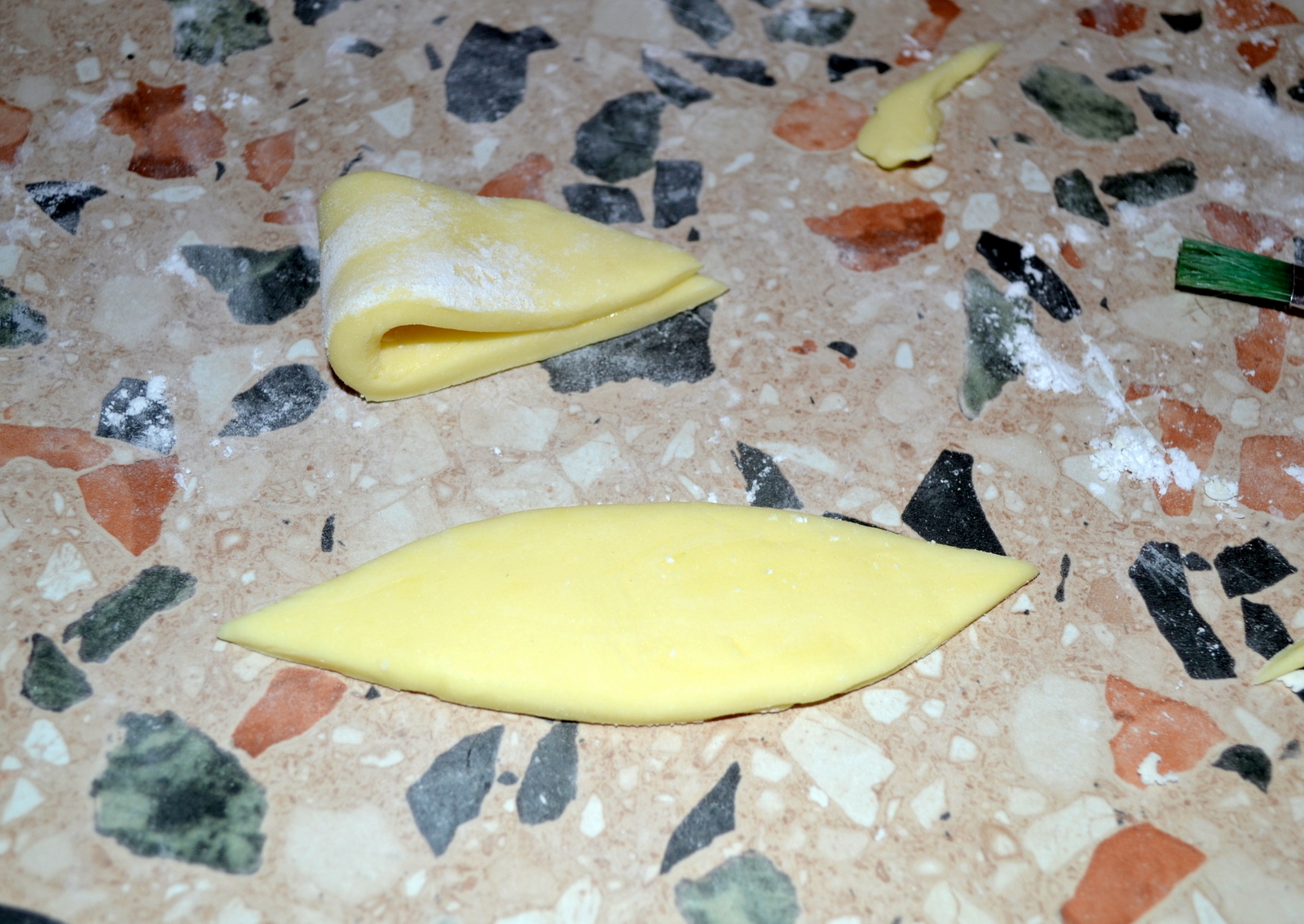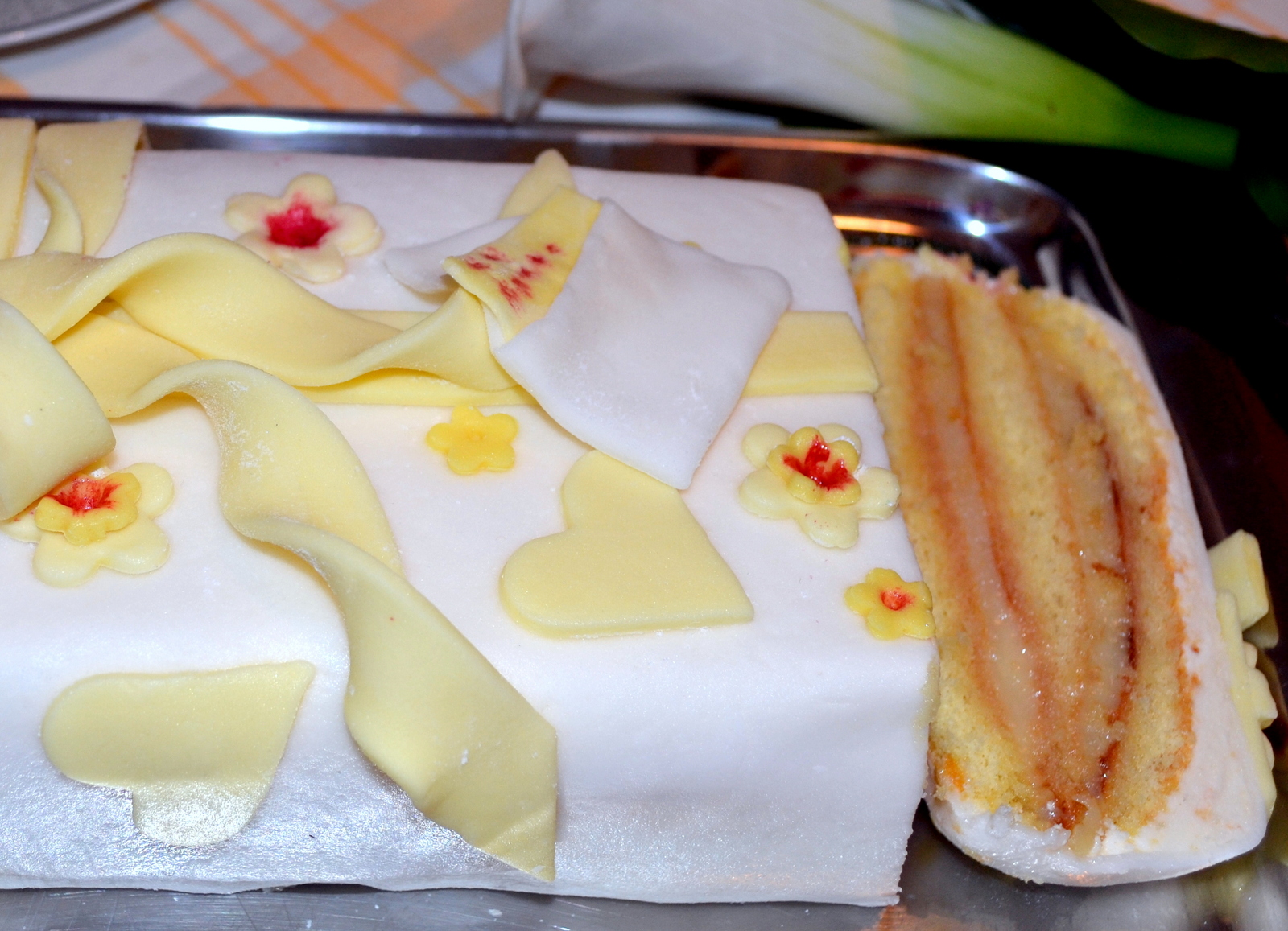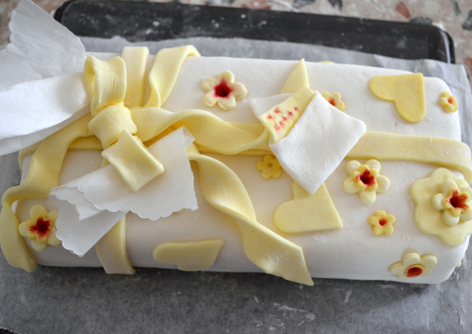 Con il resto della pasta, decorate usando formine a forma di  fiori e nastri, colorandoli di giallo e rosso o  secondo la fantasia e l’estro del momento. www.casafacilefelice.org,torta biscuit,pan di spagna,torta pacchetto