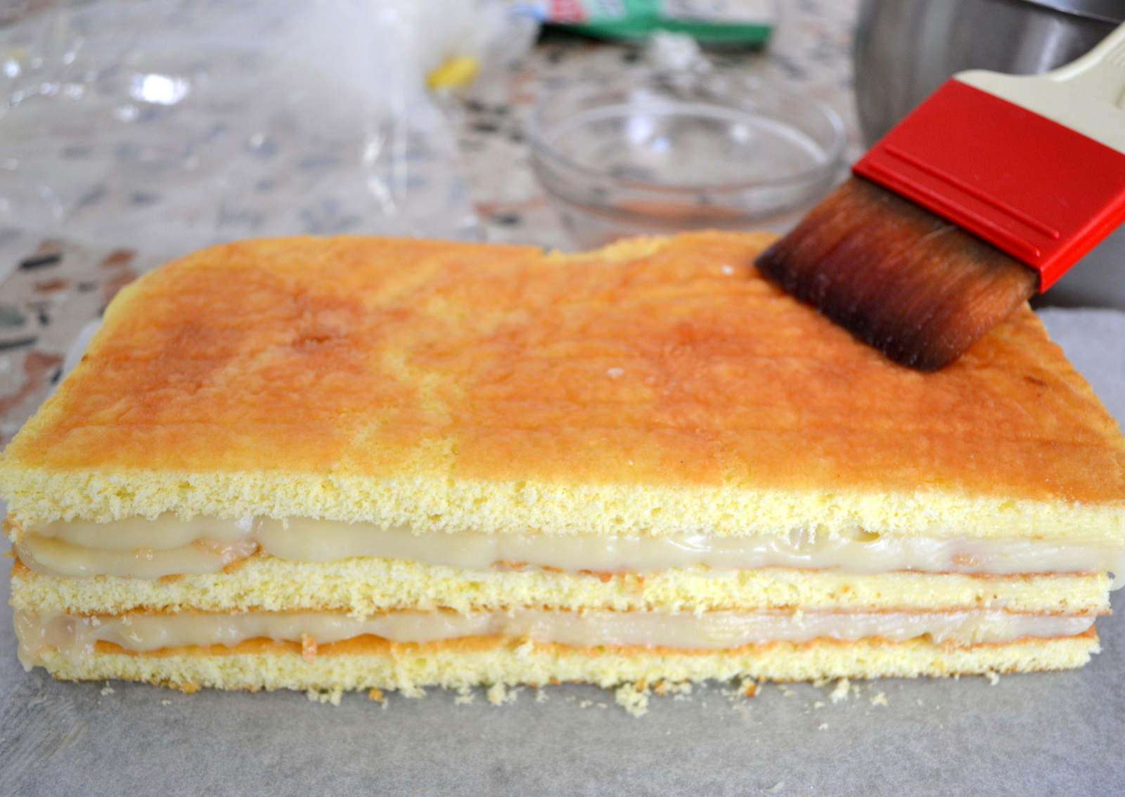 Continuate a bagnare gli strati e farcire con la crema.www.casafacilefelice.org,torta biscuit,pan di spagna,torta pacchetto