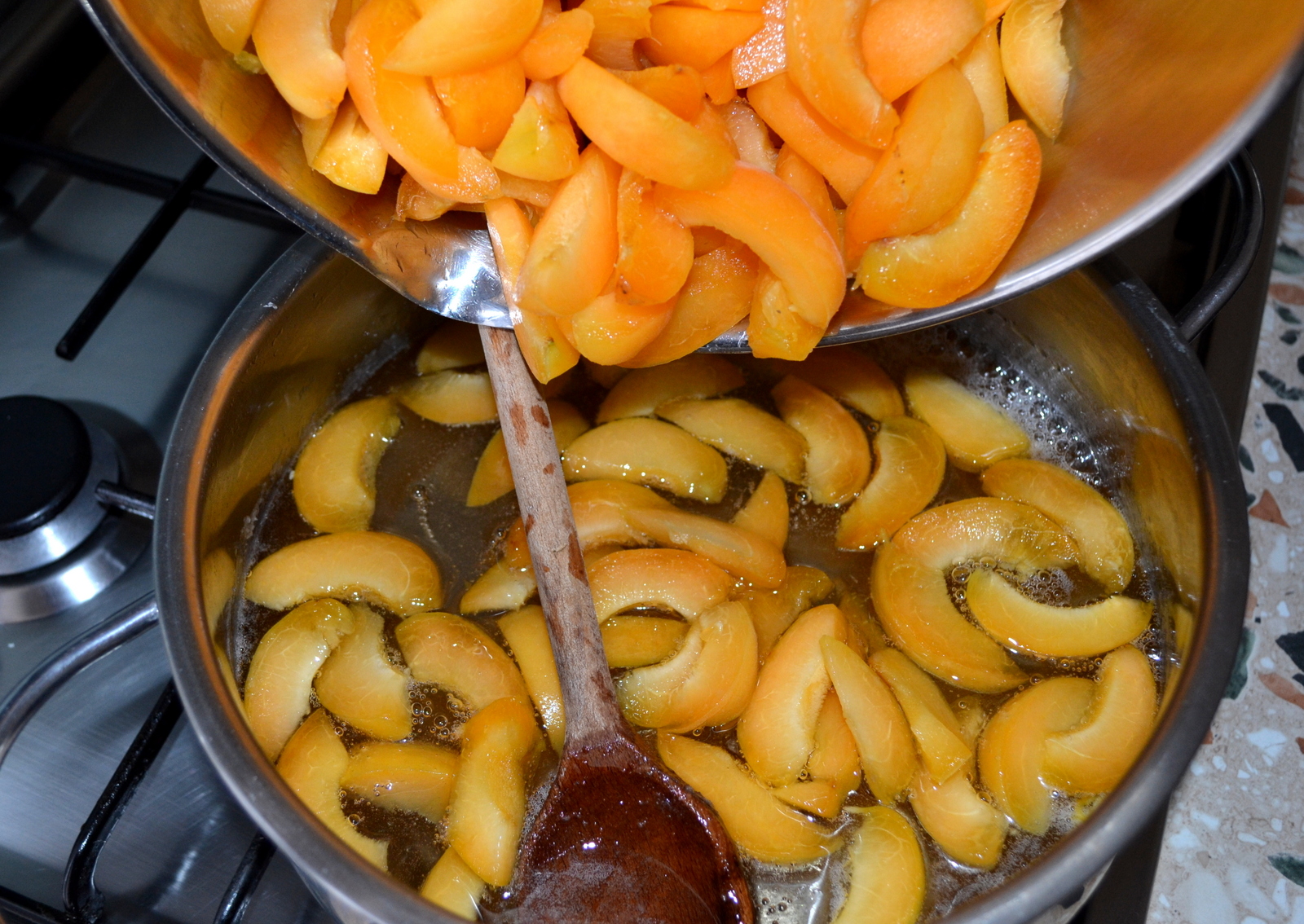 Preparate lo sciroppo, facendo bollire l’acqua, lo zucchero e gli armellini, per 10 minuti, schiumando se necessario. Trascorso il tempo, togliete gli armellini, unite le albicocche allo sciroppo e mescolate;