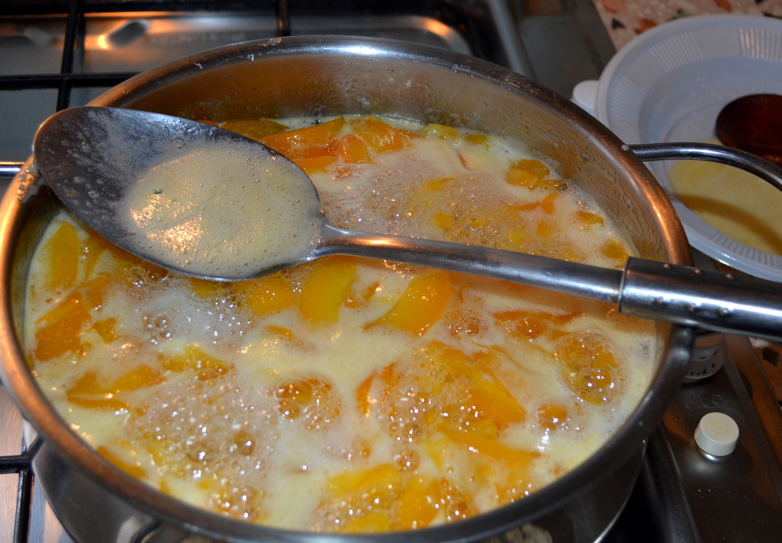 fate cuocere a fuoco moderato, schiumate bene durante la cottura. Mettete 1 piattino nel congelatore e dopo 30 minuti di cottura, cominciate a provare la densità della confettura che comunque è pronta quando cade dal cucchiaio in pezzettoni, come mostrato nella foto.