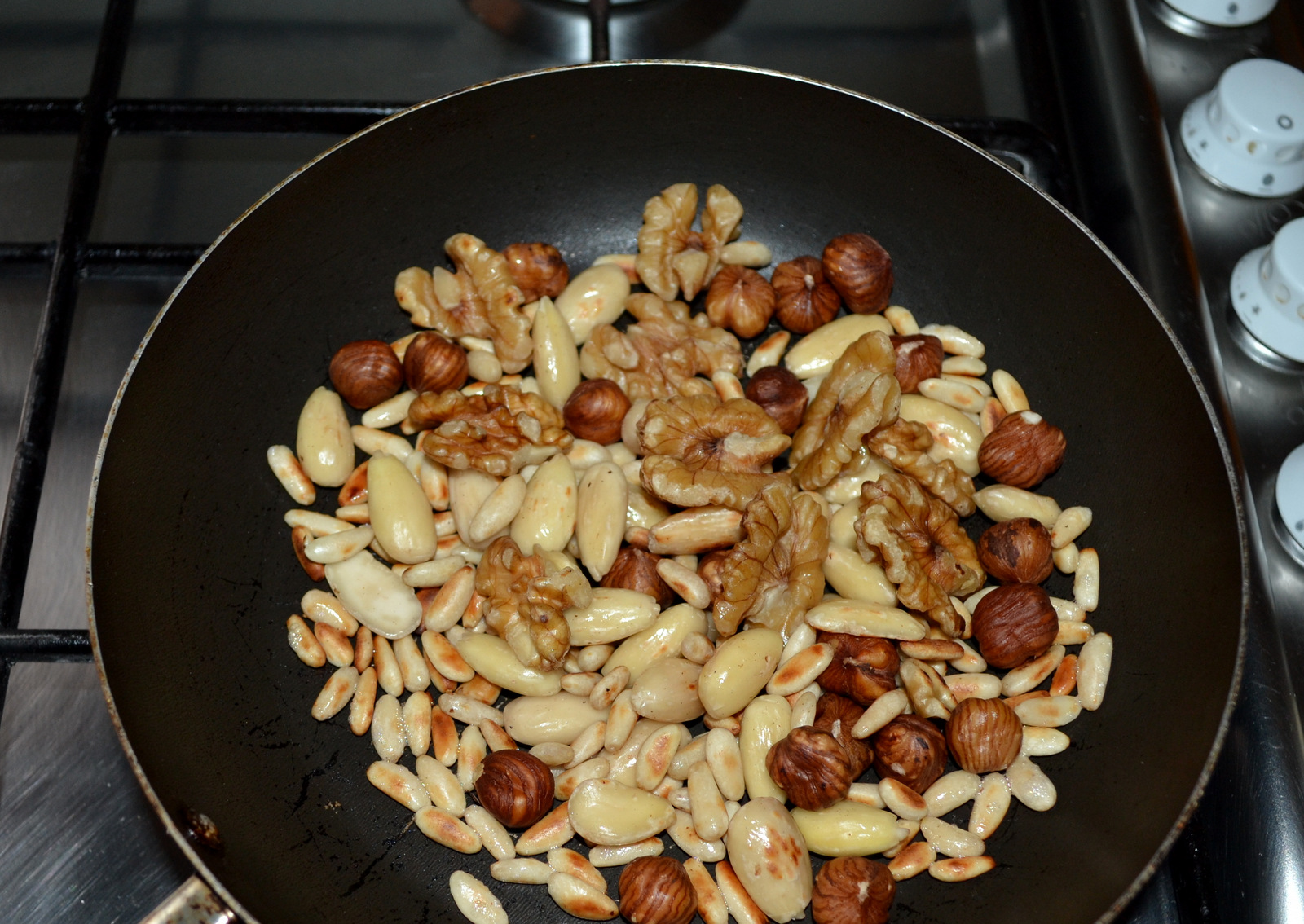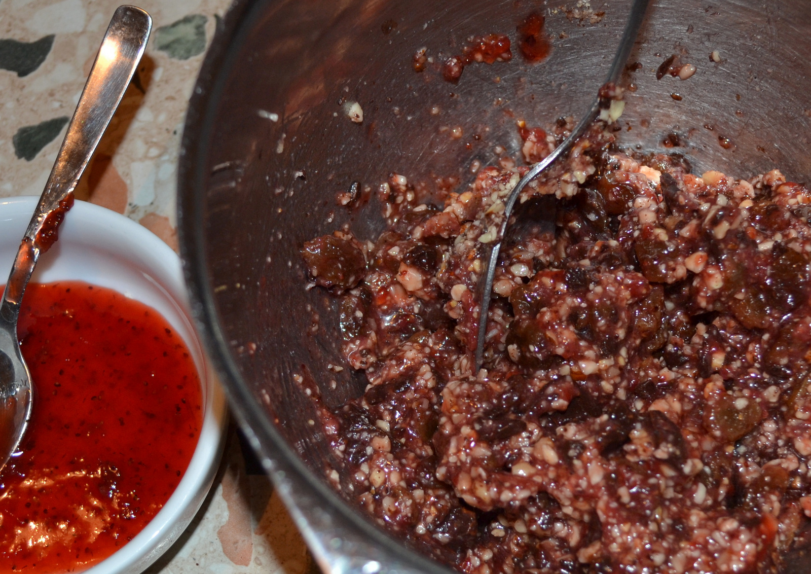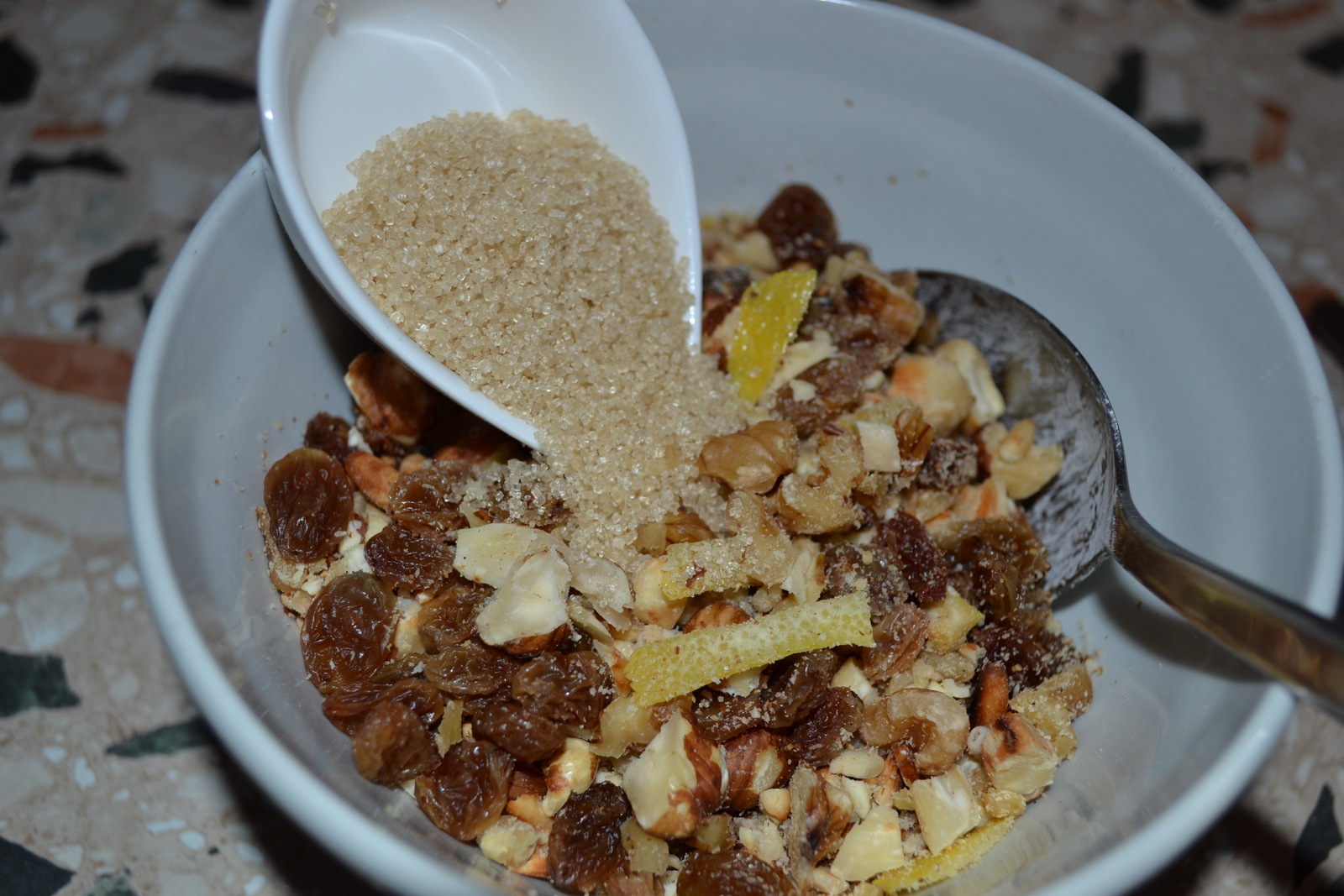 Soak the raisins in warm water (or favorite liqueur) for 15 minutes, then dry and add at chopped seeds; add the lemon zests and brown sugar; add broken chocolate and jam, mix all and set aside.