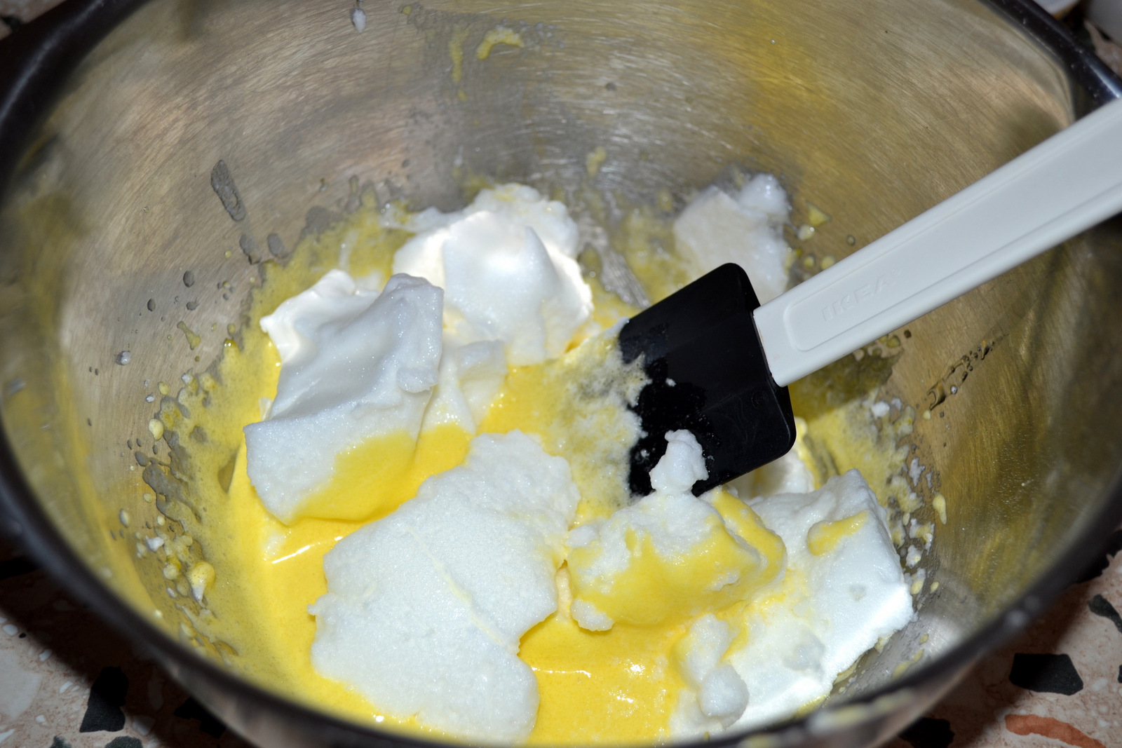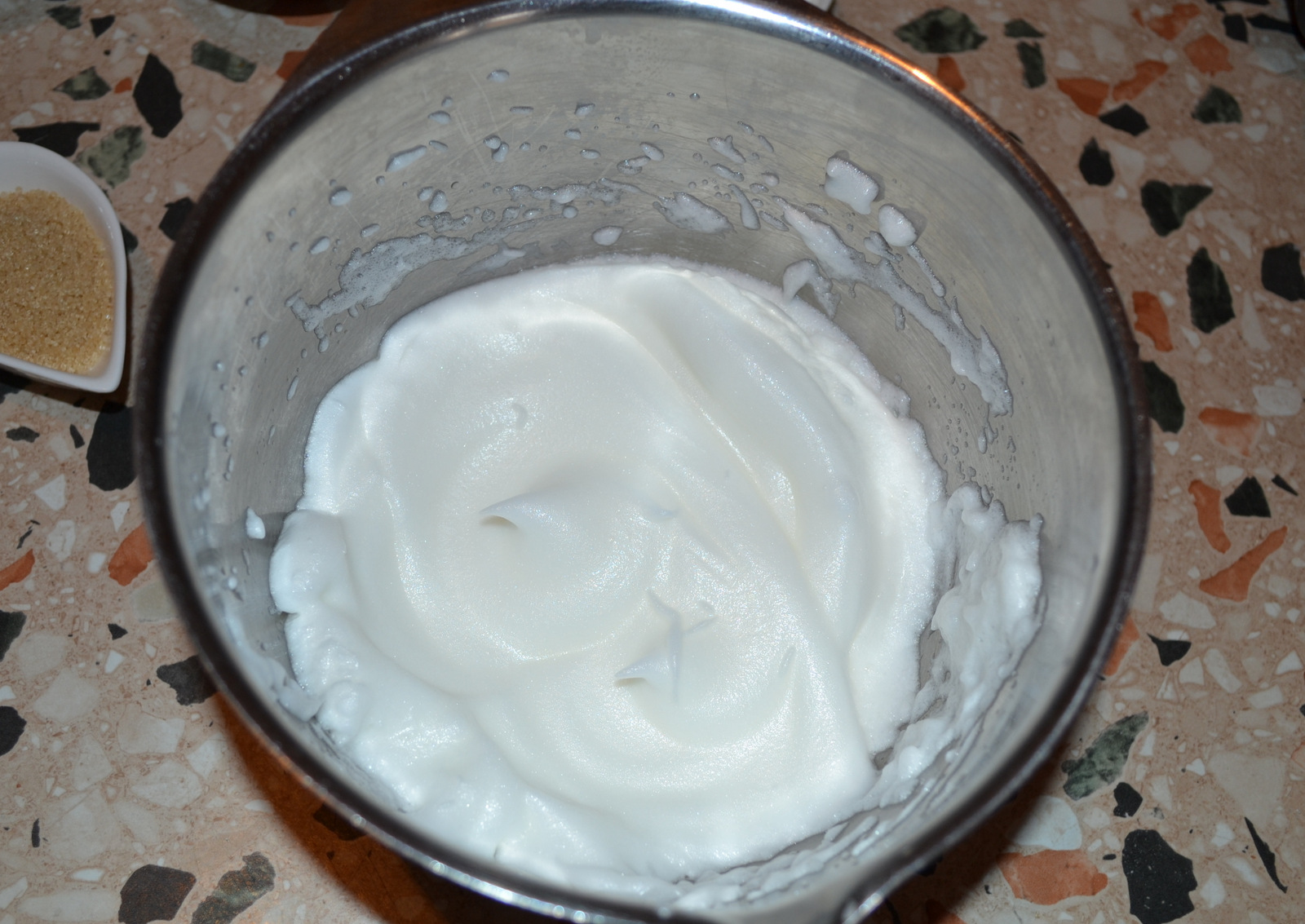 Whisk white eggs on medium food processor until form firm peaks (hold the bowl upside down, it’s thick enough if doesn’t fall).