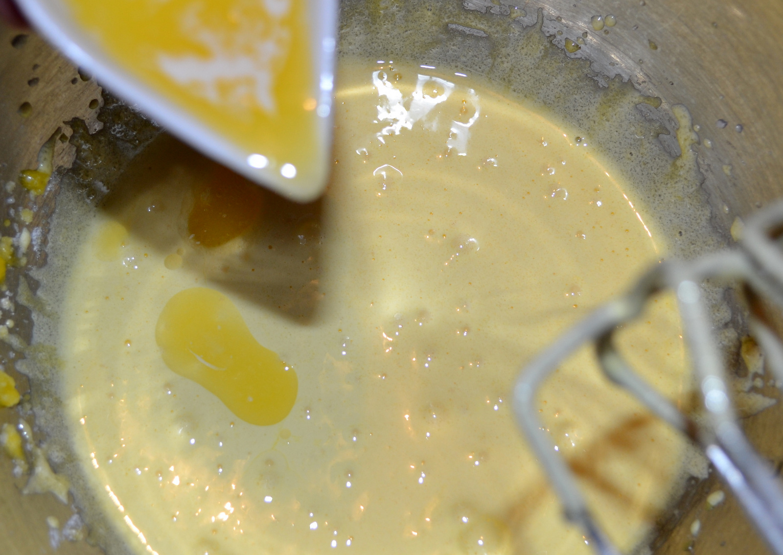 Beat the yolks and sugar togheter by hand or in the food processor, until light and creamy; add the butter, melted and stir togheter well.
