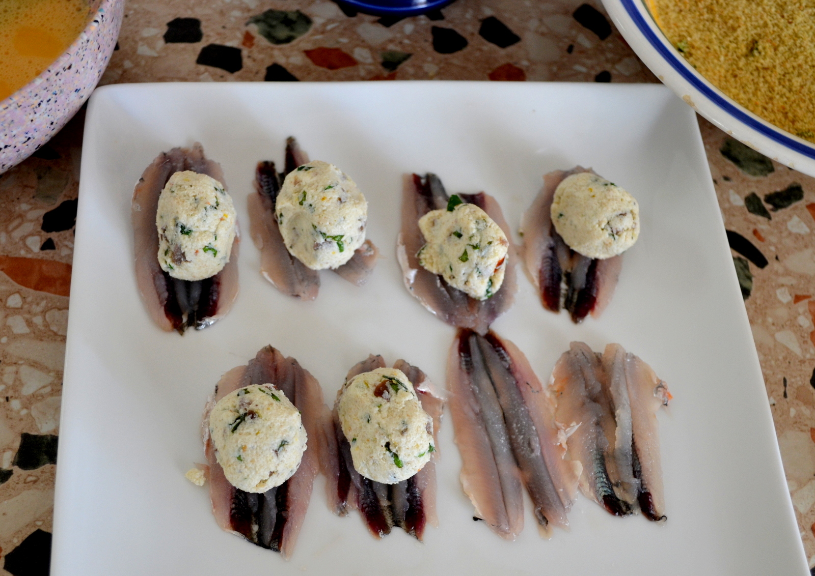 Mettete un cucchiaino di ripieno su 4 alici e coprite con le altre 4;
