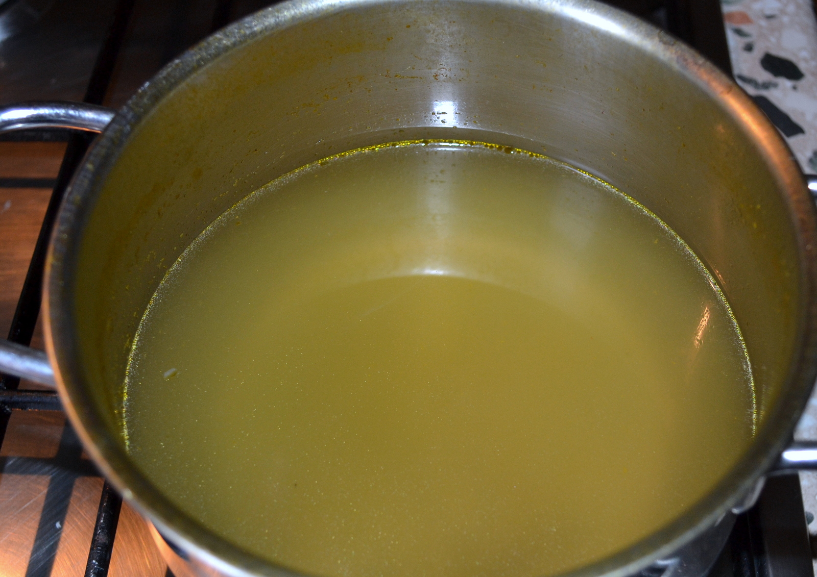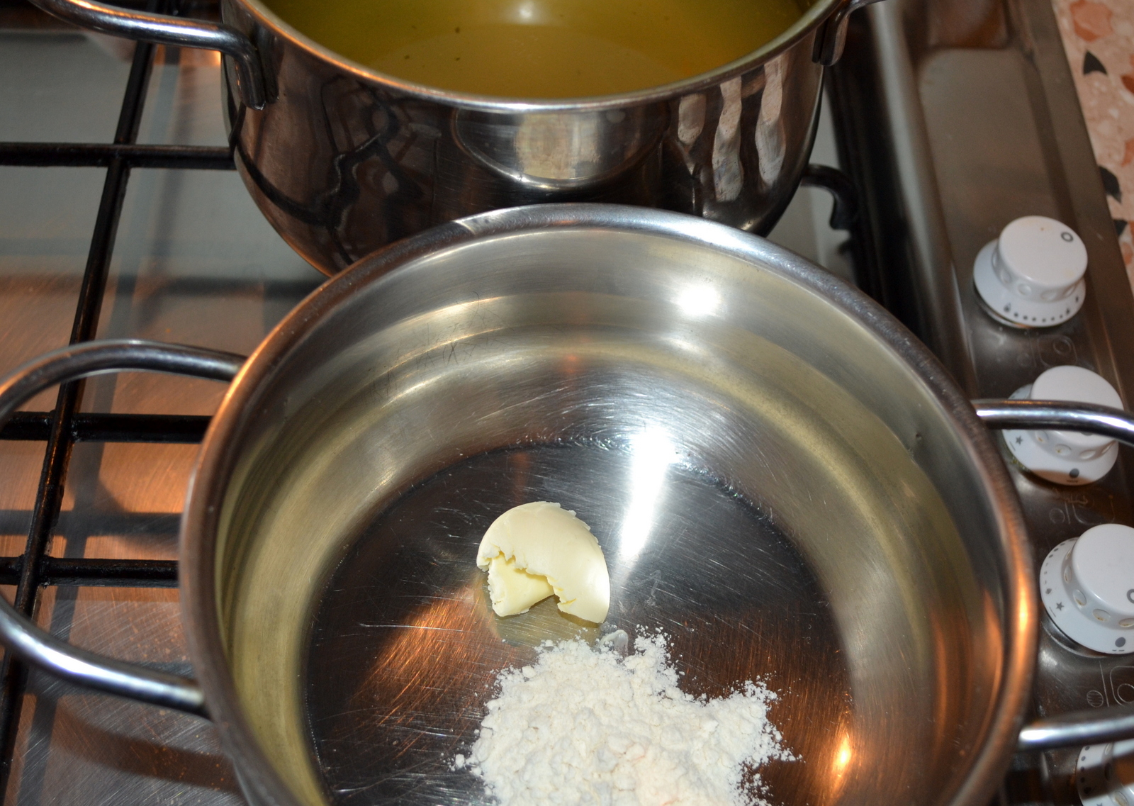 Fate scaldare il brodo vegetale, senza arrivare al bollore e tostate la farina nel burro e l’olio.