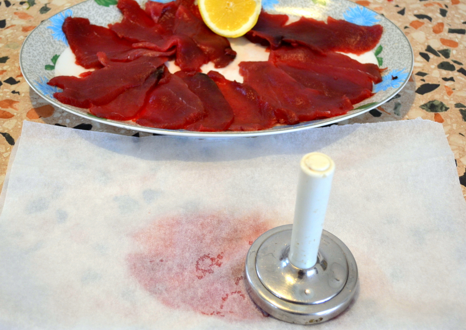 Mettete una fetta tra due fogli di carta casa e con il pesta carne, assottigliatela come mostrato nella foto. Mettete le fette nel piatto di portata e condite con olio extravergine di oliva, sale e pepe.