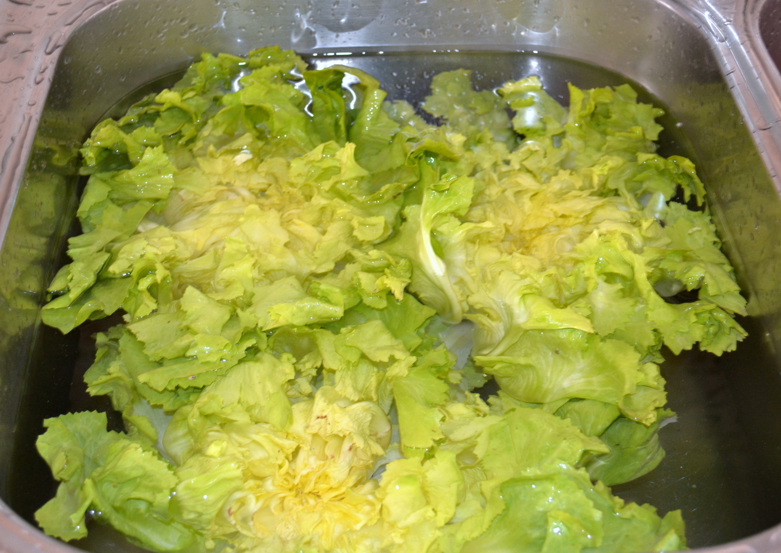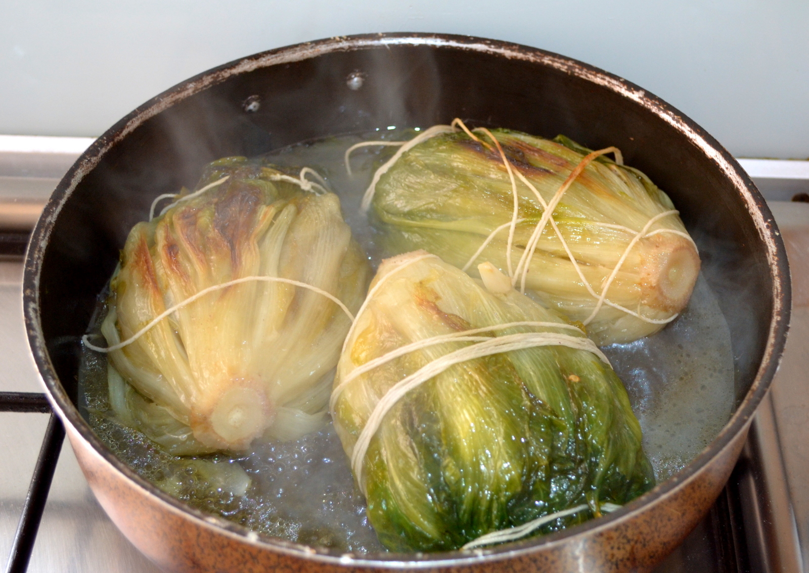 Lasciate i cuori di scarola in acqua per qualche minuto, poi sciacquateli attentamente in acqua corrente e metteteli a testa in giù sopra un canovaccio a sgocciolare.