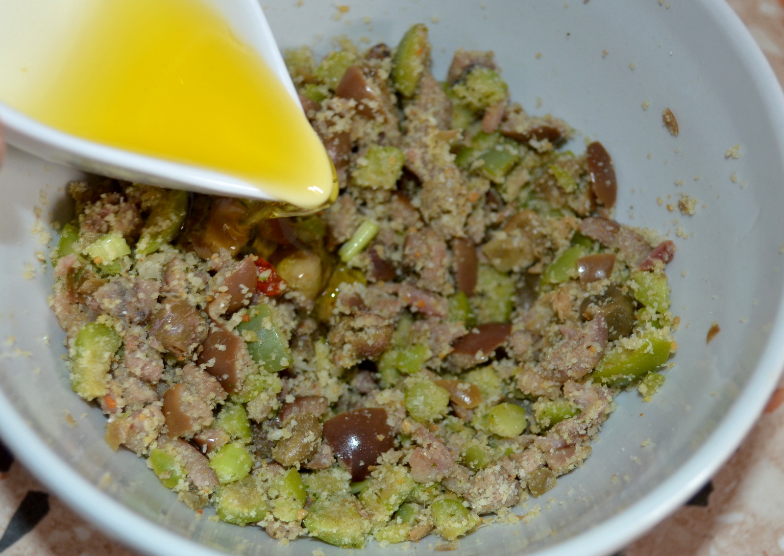 Preparate il ripieno sminuzzando tutti gli ingredienti e amalgamandoli con l’olio d’oliva.