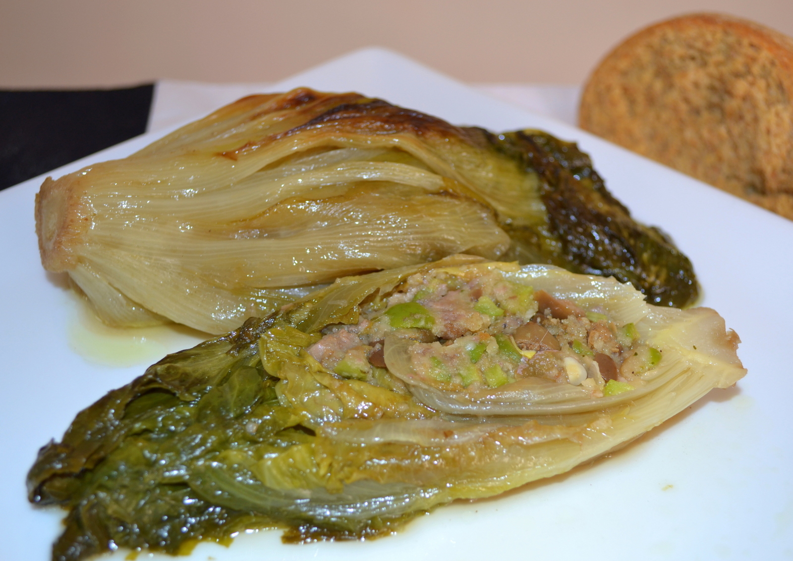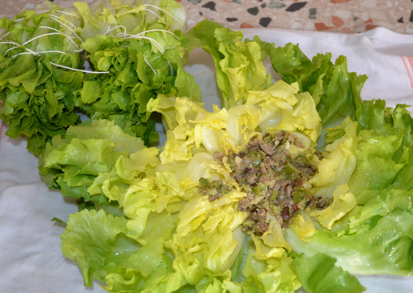 Dividete il ripieno in 3 parti e imbottite i cuori di scarola; richiudete pressando delicatamente per non staccare le foglie e legate con lo spago per alimenti.