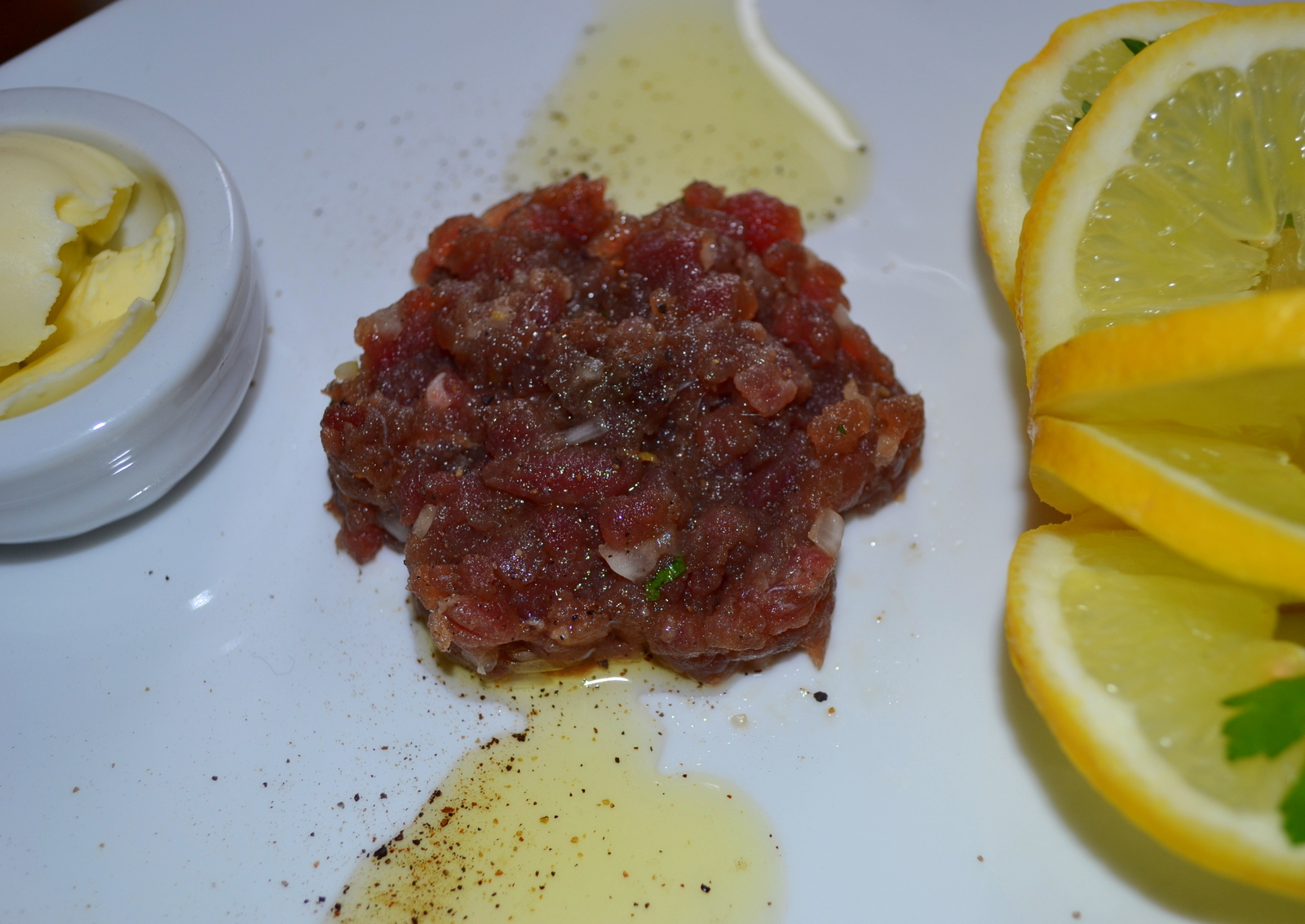 Quando sarà trascorso il tempo, poggiate un coppa pasta al centro del piatto di portata e mettete dentro 2 o 3 cucchiaiate di trito, premete appena, togliete il coppa pasta e condite con un filo di olio d’oliva e pepe. Preparate tartare fino ad esaurimento del tonno. Se non avete il coppa pasta, ungete le dita, formate un mucchietto e schiacciatelo al centro. Servite con riccioli di burro in una ciotolina.