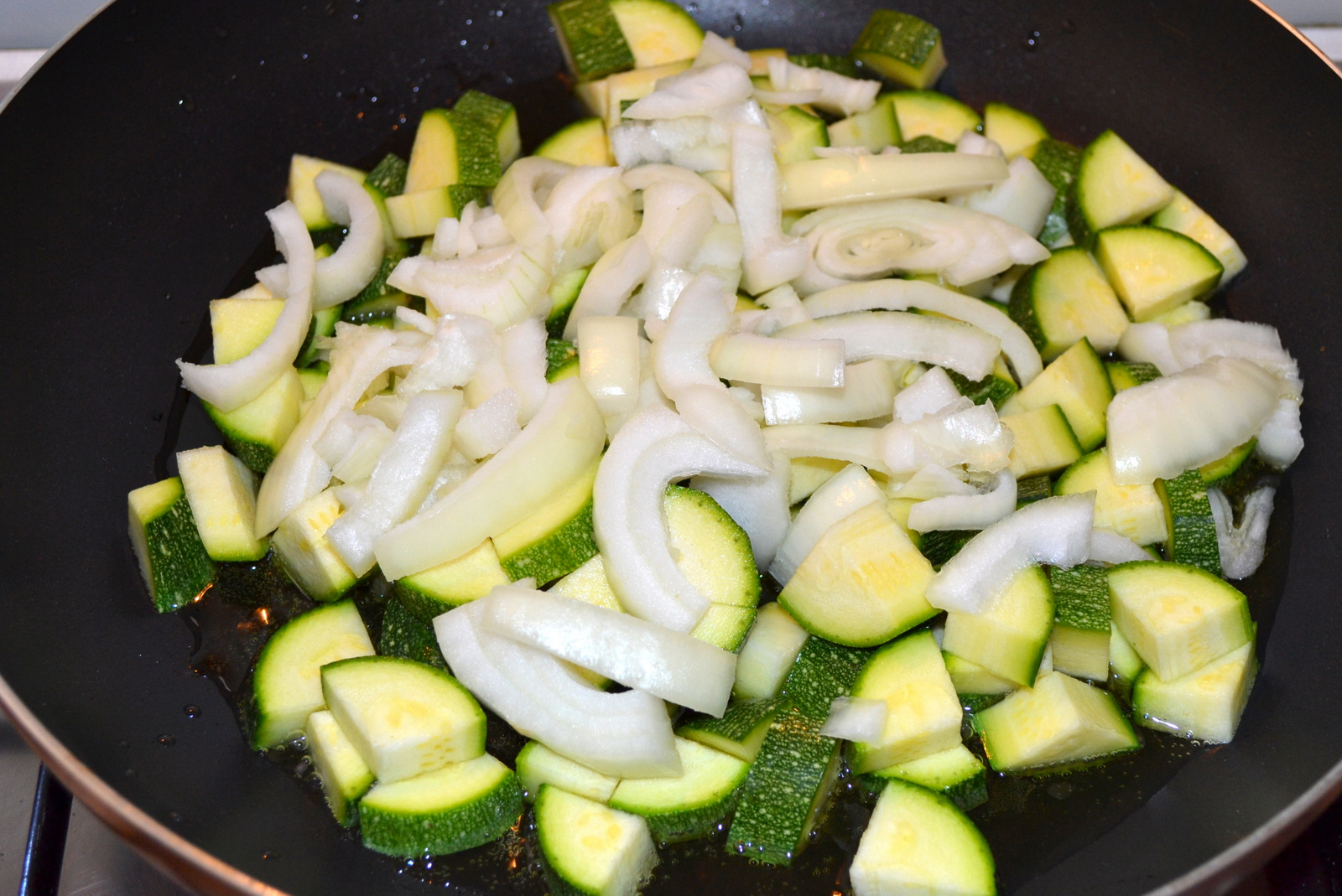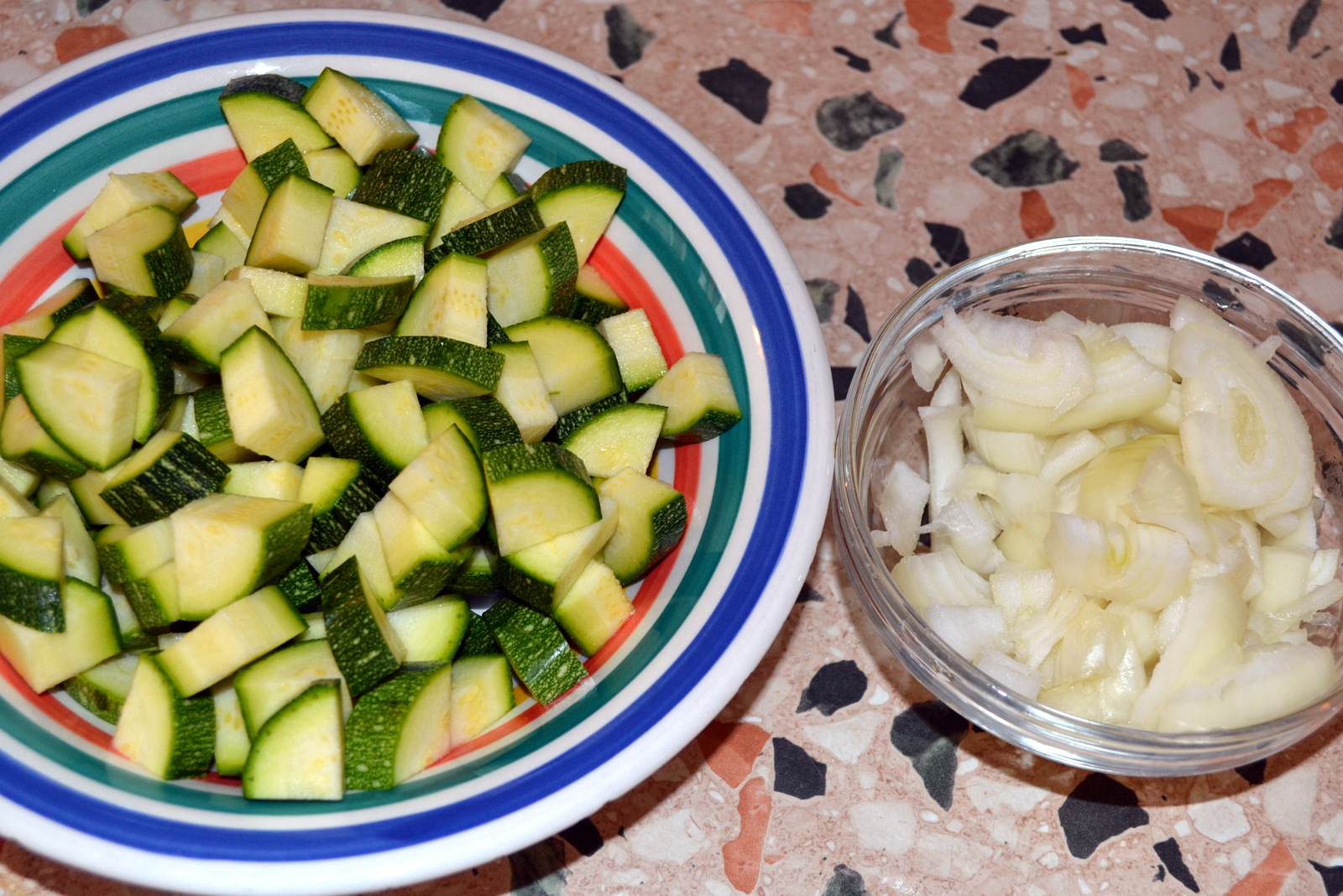 Wash 600 grams of courgettes “zucchini” and abaut 200 grams of onions and cut them into a little pieces,