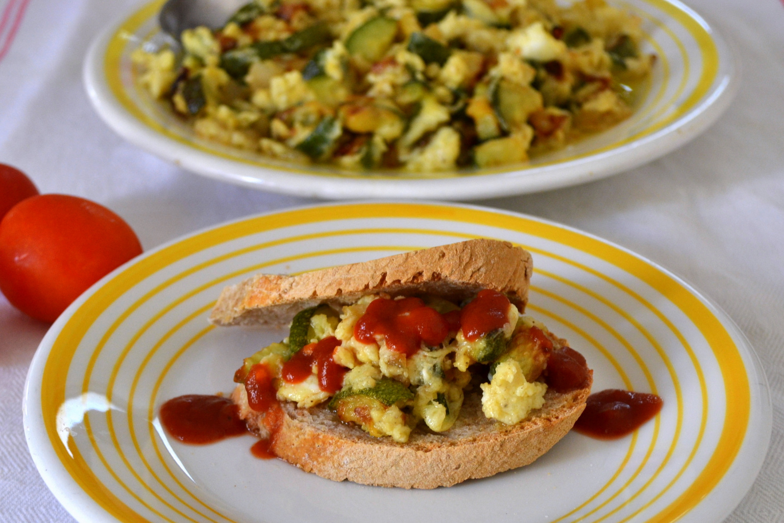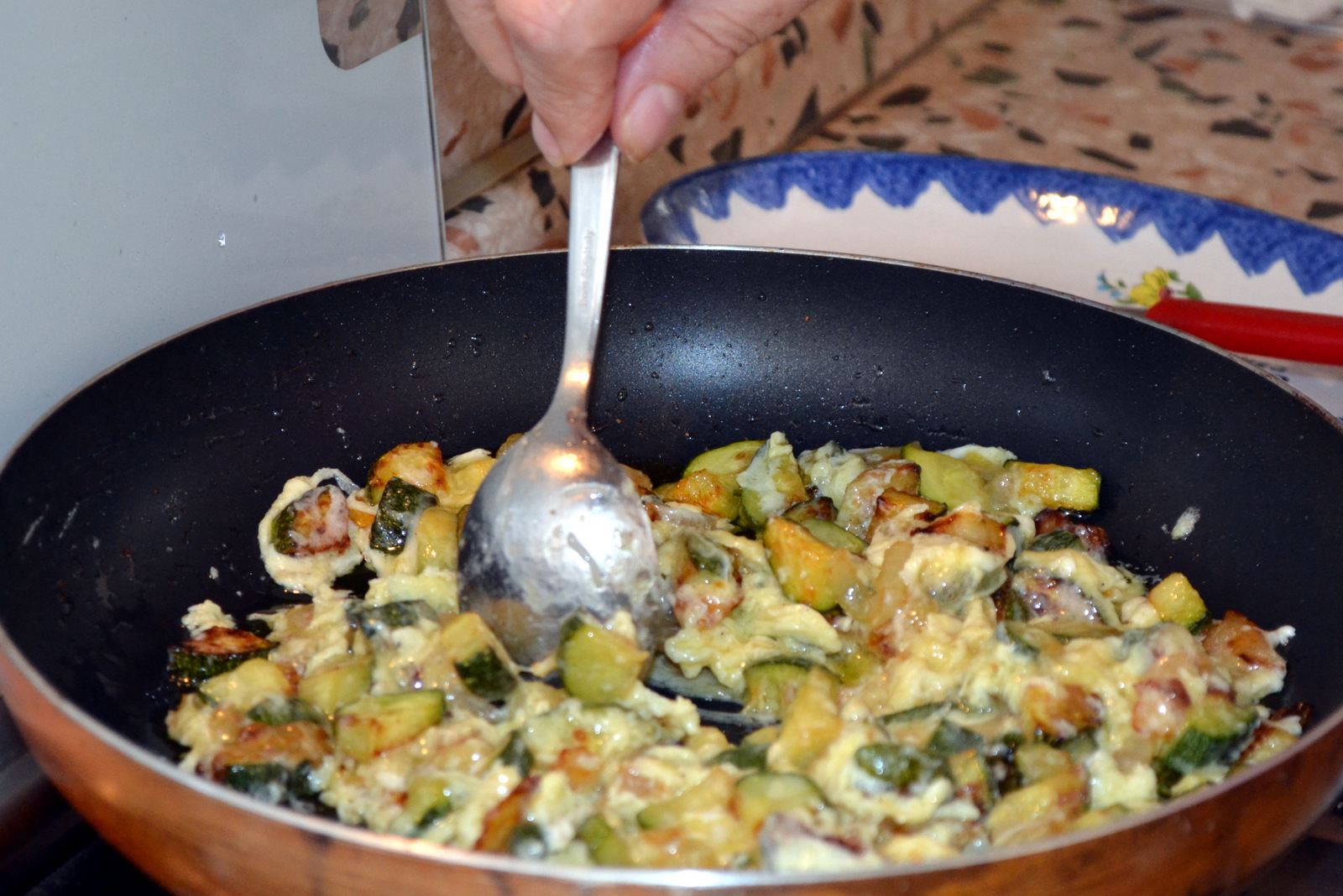 When the zucchini and onions seem cooked, add the eggs and mix continuously until they thicken.