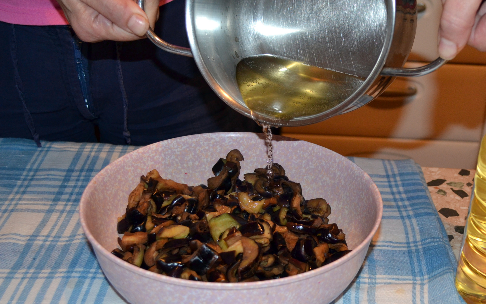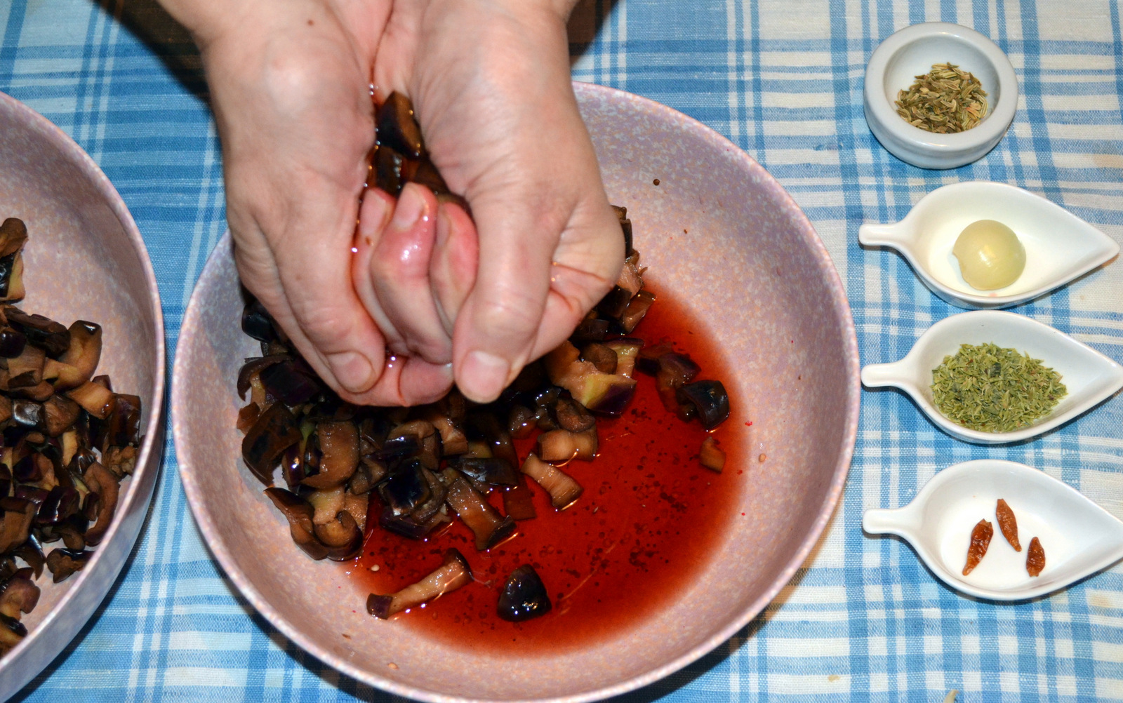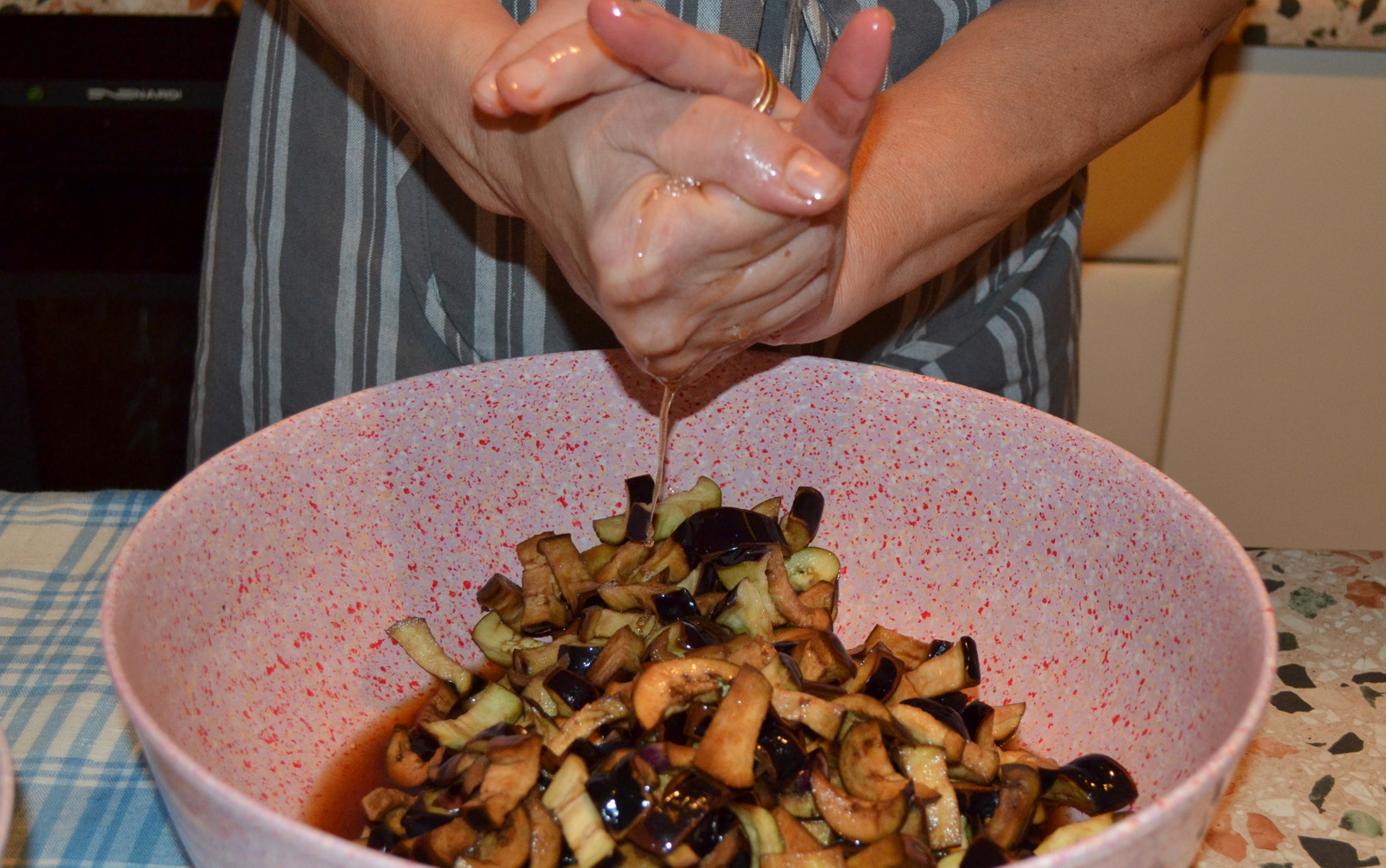 Trascorso il tempo, riprendete la scodella e mescolate le melanzane; prendetene una cucchiaiata alla volta, strizzatele bene tra le mani in modo che perdano tutto l’amaro e mettetele in una scodella pulita. Se volete potete usare lo schiaccia-patate, strizzandole almeno due volte o fino a quando saranno ben asciutte.