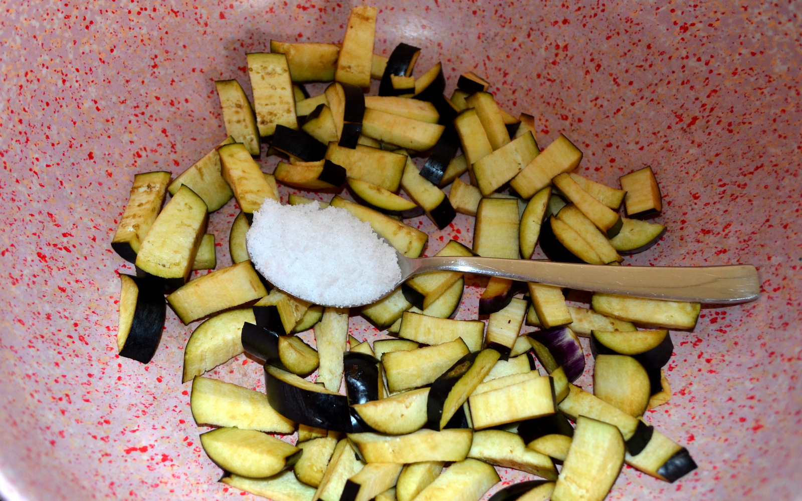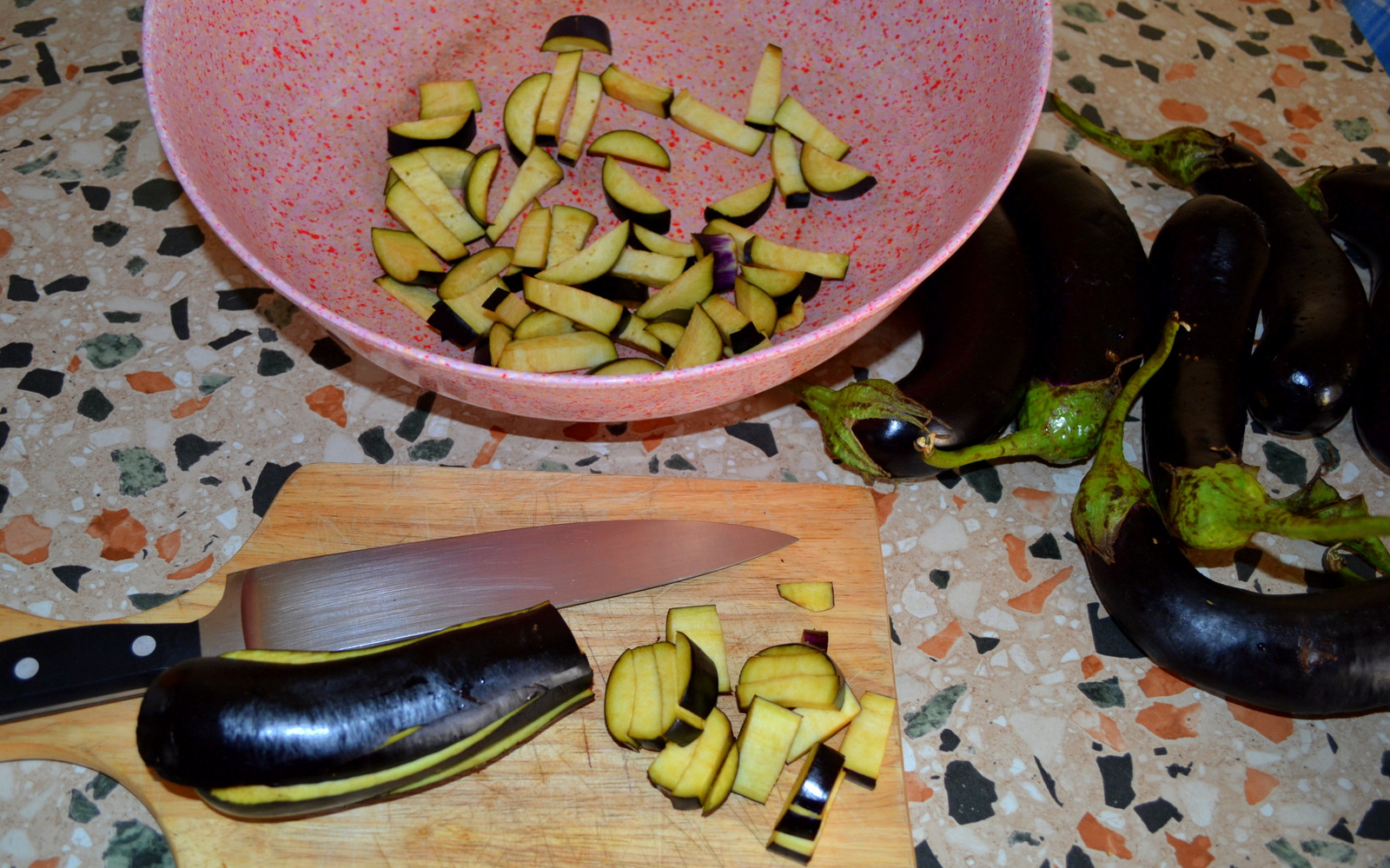Lavate e asciugate bene le melanzane prima di togliere il peduncolo e la corolla; tagliatele a tocchetti e mettetele in una scodella;