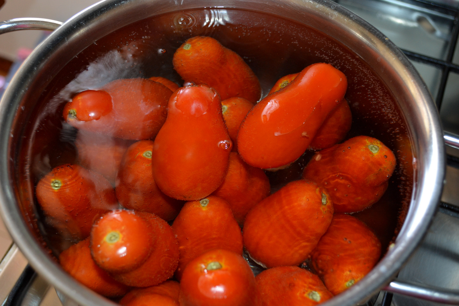Mettete una pentola sul fuoco riempita per metà di acqua e quando bolle, calate i 20 pomodori che avete tenuto da parte e fate riprendere il bollore; dopo due minuti, scolateli e lasciateli intiepidire.