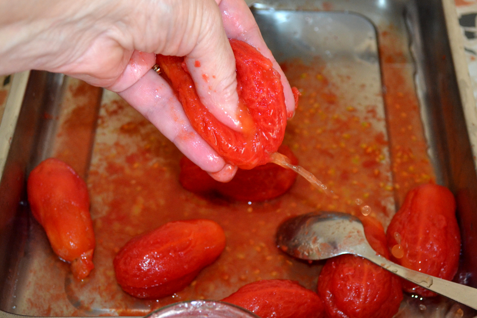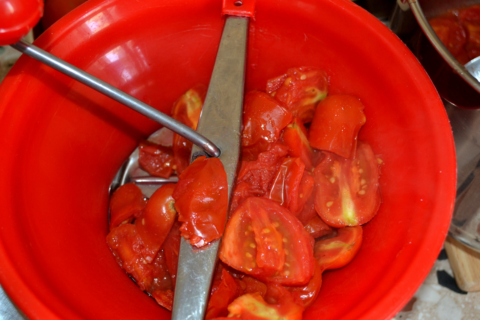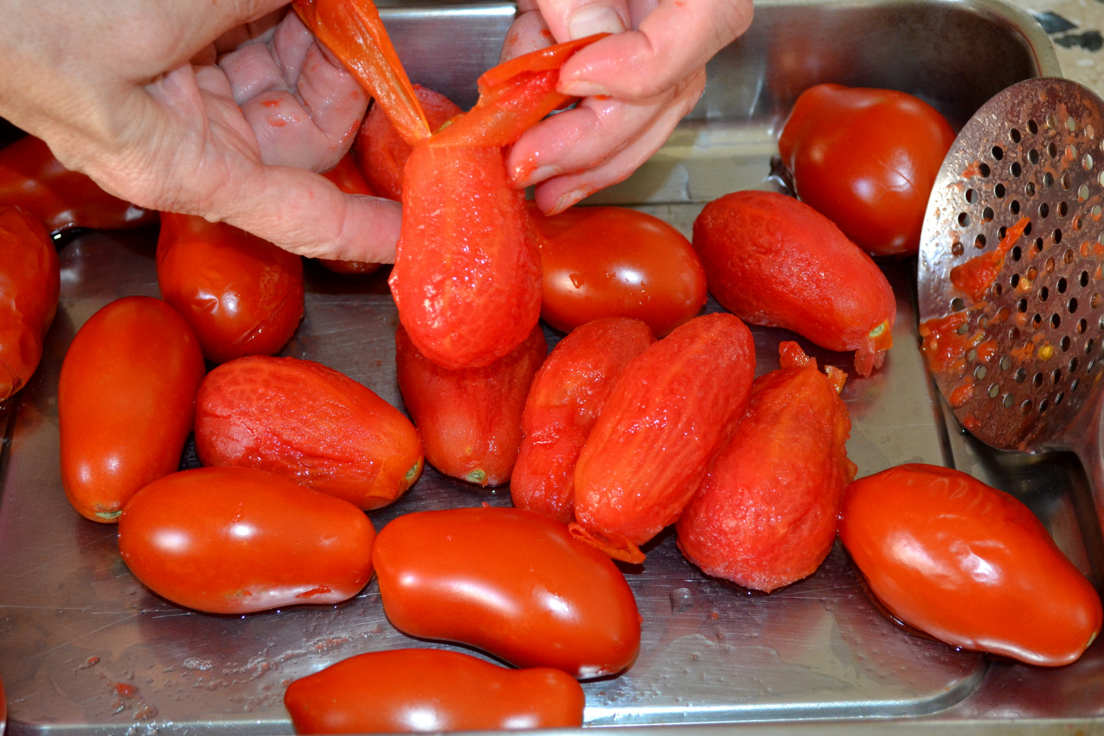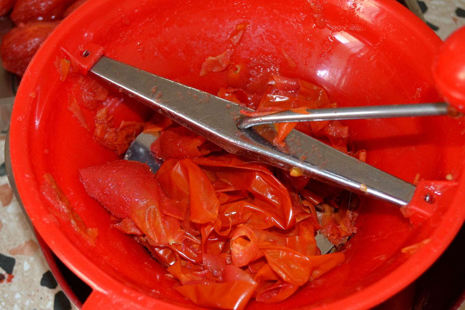intanto, sbucciate i pomodori che si saranno intiepiditi e passate anche queste bucce nel passa-verdure, per recuperare il sugo.