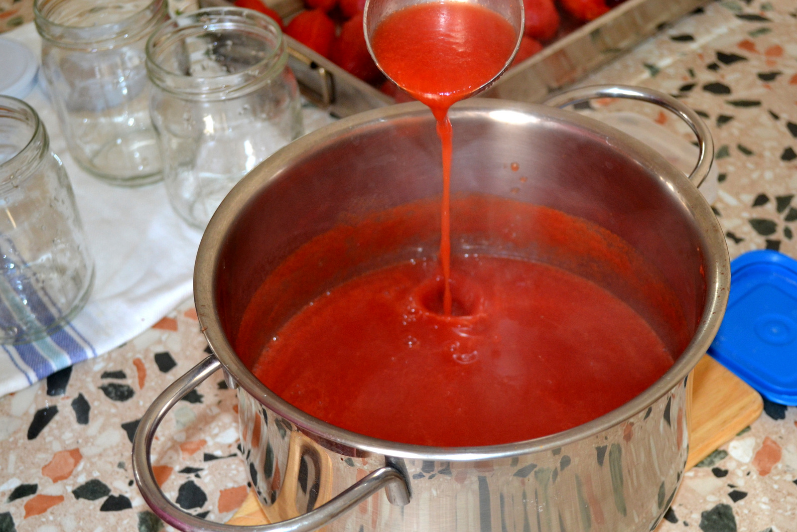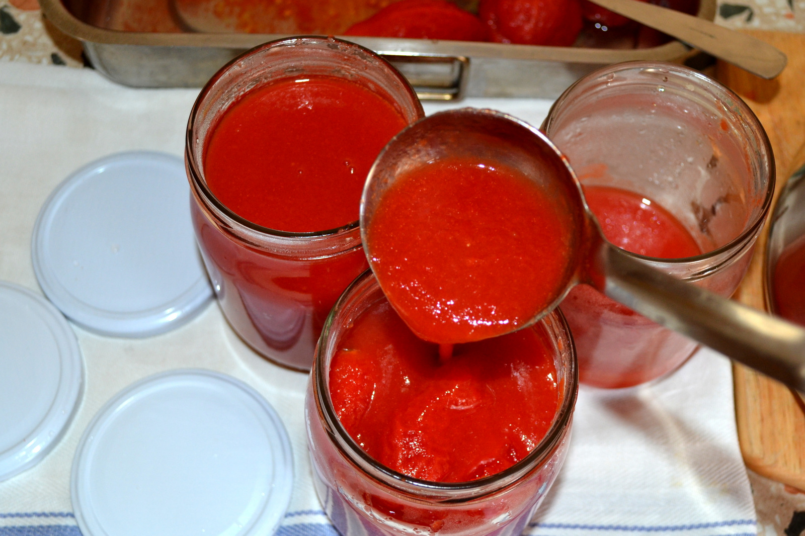 Ci sono infiniti modi per conservare i pomodori, si può fare la salsa, la passata densa, i pelati, a pezzetti, a fette, … questo che segue è adatto per fare un sugo saporito per condire  la pasta di grano duro e  quella fatta in casa. Io preparo questa particolare conserva di pomodoro, sopratutto perché è perfetta per la pizza, marinara, margherita,… . E’ una passata  densa,  liscia, cremosa,  con filetti di pelati, senza semi e senza bucce.