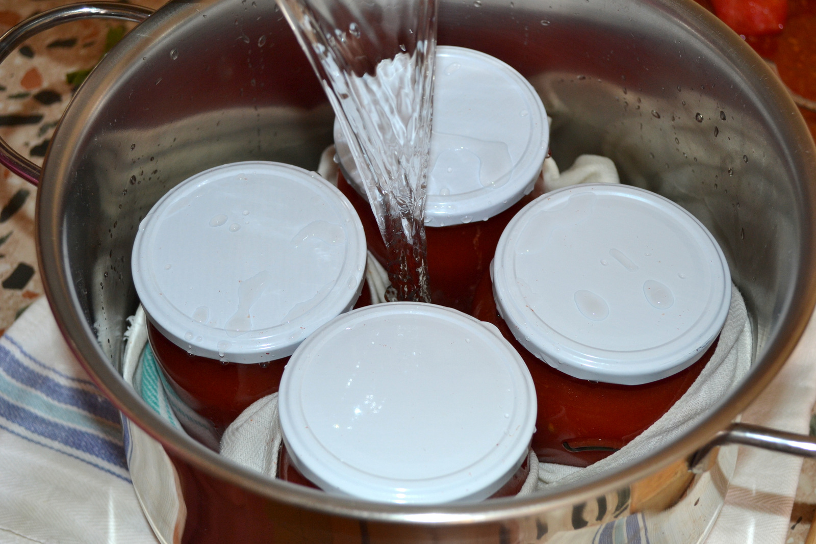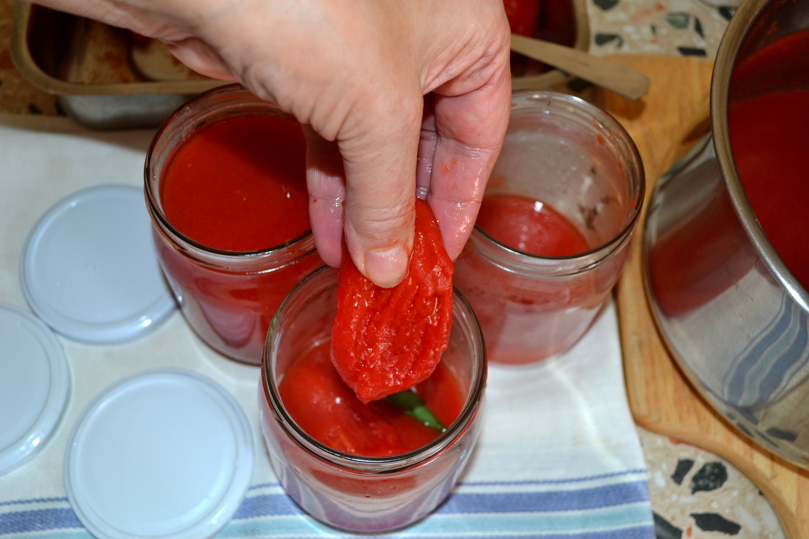 ricordate di schiacciare leggermente i pomodori per far uscire i semi prima di invasarli; tappate bene e avvolgete in un canovaccio, mettete in una pentola con acqua che lasci fuori i coperchi per 1 – 2 centimetri e sterilizzate, facendo bollire per 30 – 40 minuti.