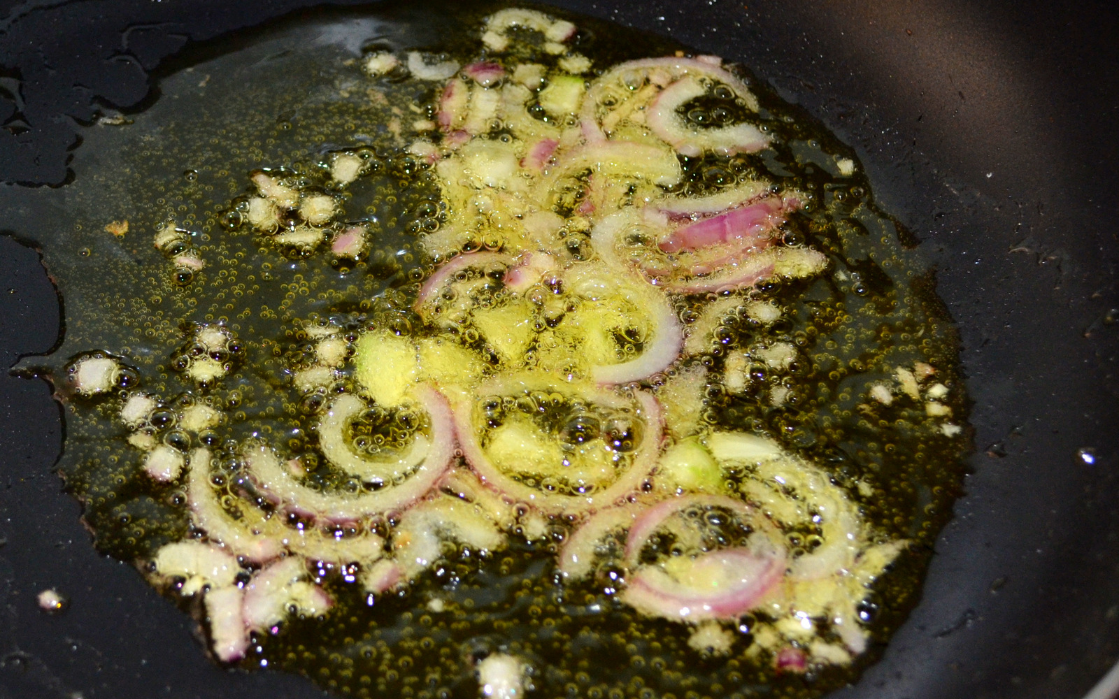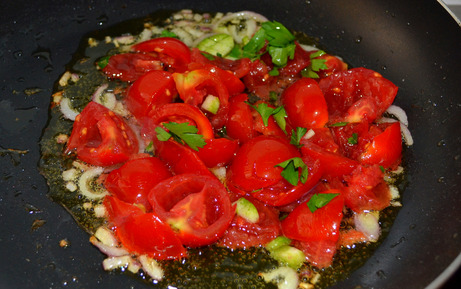 Mettete un po di olio in una padella, fate soffriggere l’aglio, la cipolla tritati grossolanamente e un peperoncino piccante piccolissimo intero; prima che la cipolla imbiondisca, aggiungete i pomodori tagliati in quattro parti e privati dei semi.