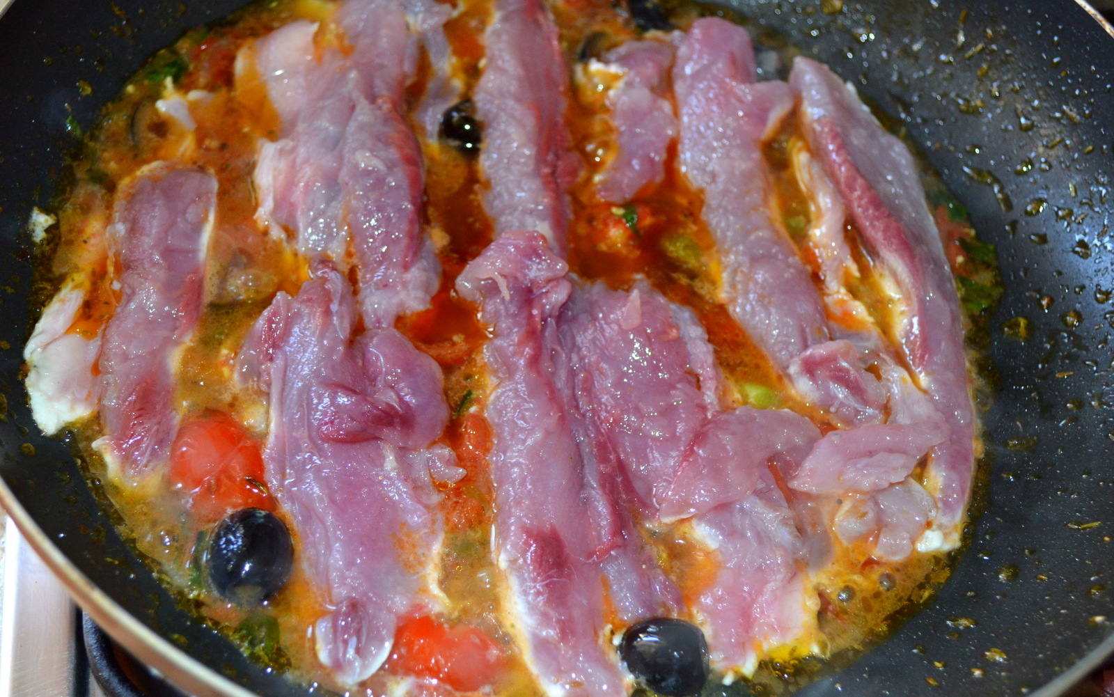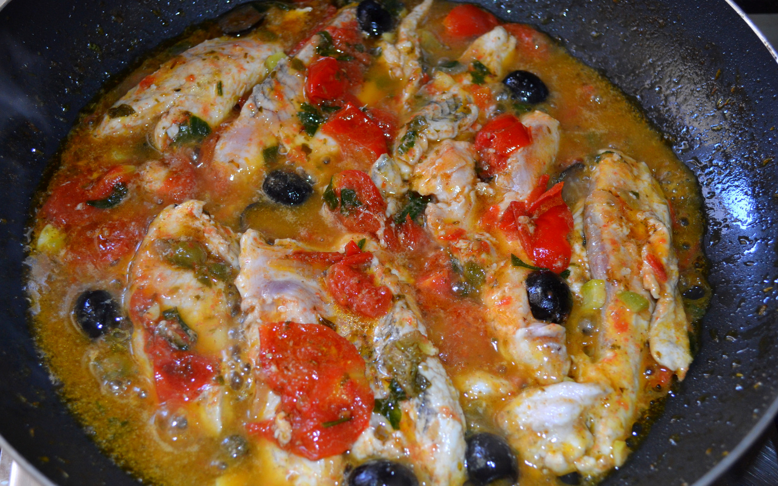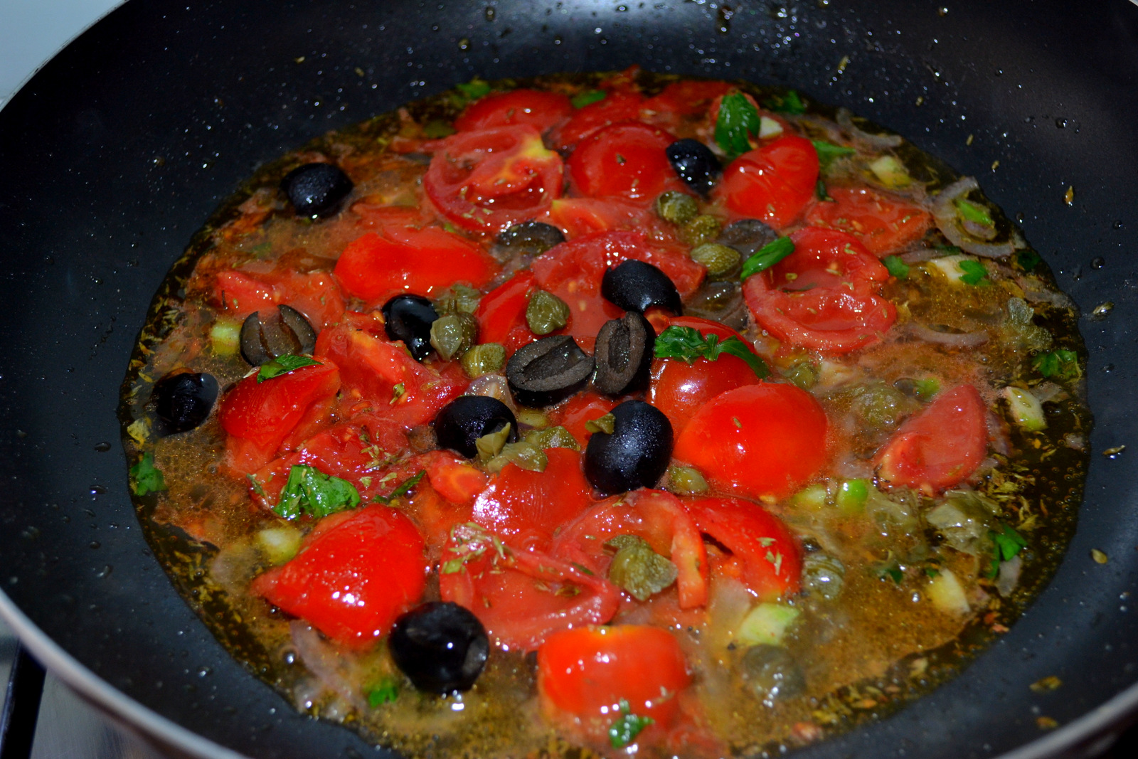 Fate cuocere 2  minuti e  aggiungete i capperi lavati e strizzati  e le olive private dei noccioli, mescolate e fate cuocere per un paio di minuti. Se necessario, aggiungete un cucchiaio di vino bianco secco.   Allineate i filetti di pesce sull’intingolo, mettete un pizzico di sale  e fate cuocere per 1,5 – 2  minuti; rivoltate i filetti  e lasciate andare per altri 2 minuti o poco meno.