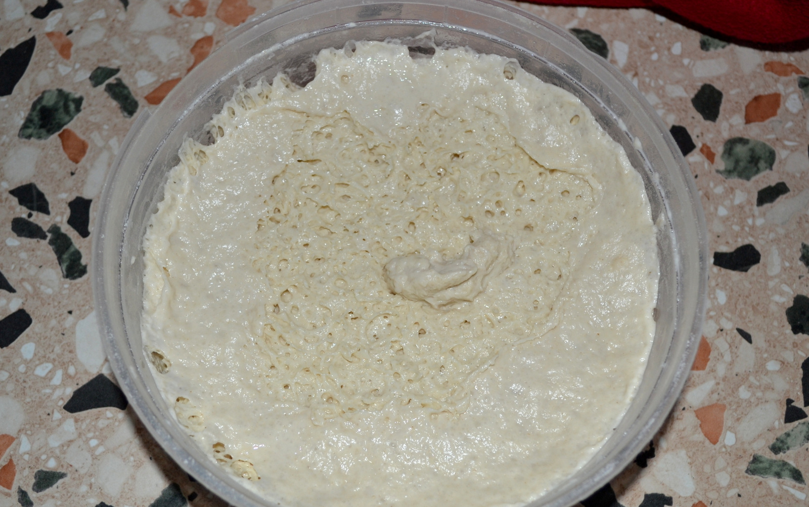 impastate fino a formare un panino di pasta madre liscio e omogeneo. Mettete in una scodella con chiusura ermetica, così da evitare che faccia la crosta e lasciate lievitare in un posto caldo, il forno spento andrà benissimo. Quando avrà raddoppiato il suo volume (3 – 4 ore circa), pesate il panino, pesate la stessa quantità di farina e la metà di acqua ( se il panino è 150 grammi, pesate 150 grammi di farina e 75 grammi di acqua); rompete il panino di pasta madre in piccoli pezzetti e metteteli nell’acqua alla quale avrete aggiunto un pizzico di zucchero;