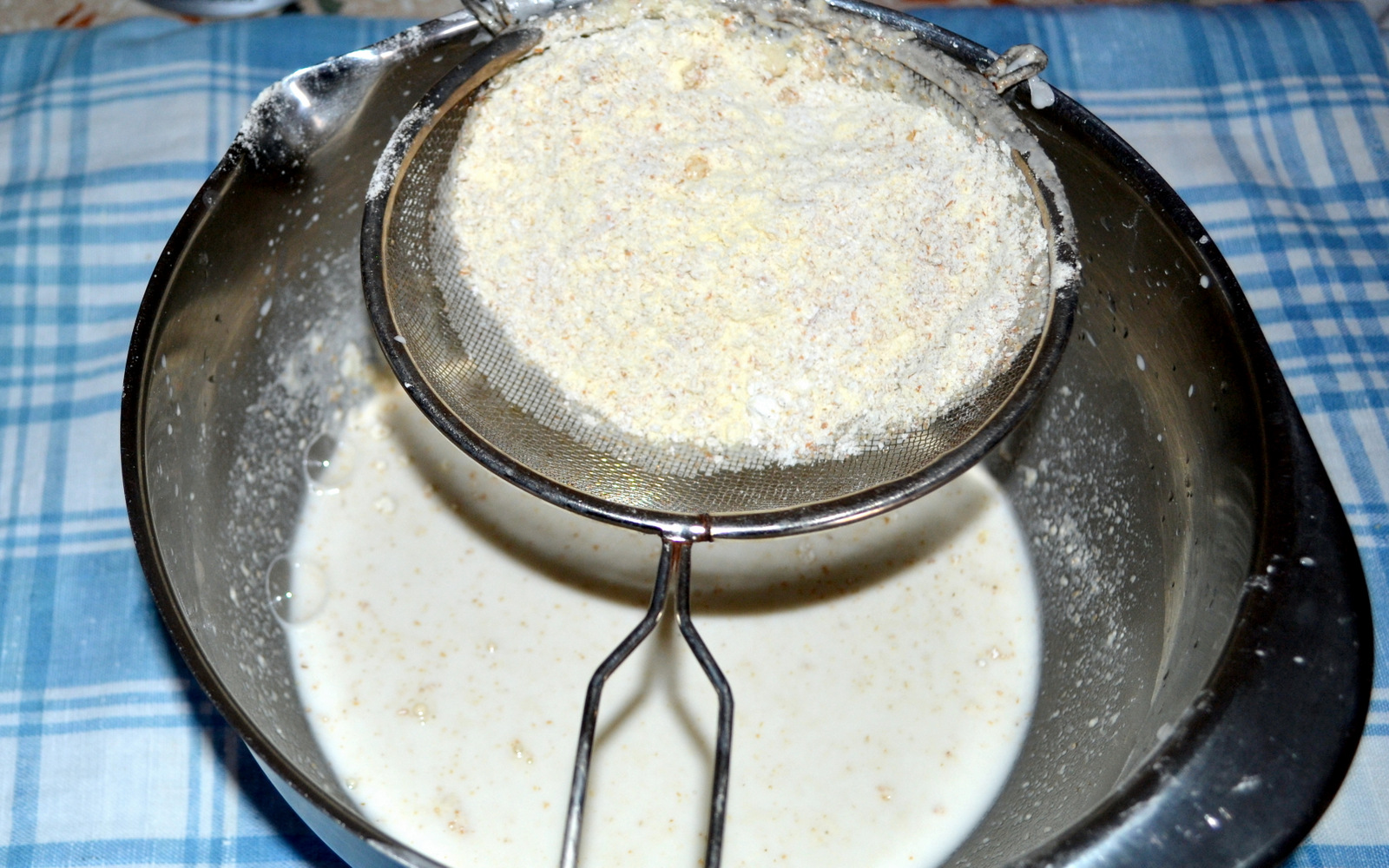 Pesate il lievito madre (300 grammi circa), pesate il doppio circa di farina (da 400 a 600 grammi circa) e metà di acqua ( da 350 a 500 grammi circa). Mettete l’acqua in una scodella capiente, meno 50 grammi che metterete da parte, in un bicchiere (vi servirà per sciogliere il sale); aggiungete il lievito tagliato a pezzettini e lavoratelo con le dita, fino a formare una crema. Setacciate metà delle farine miste nella crema e lavorate fino ad assorbimento;