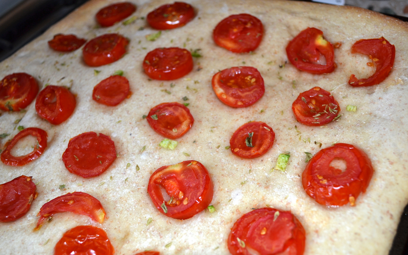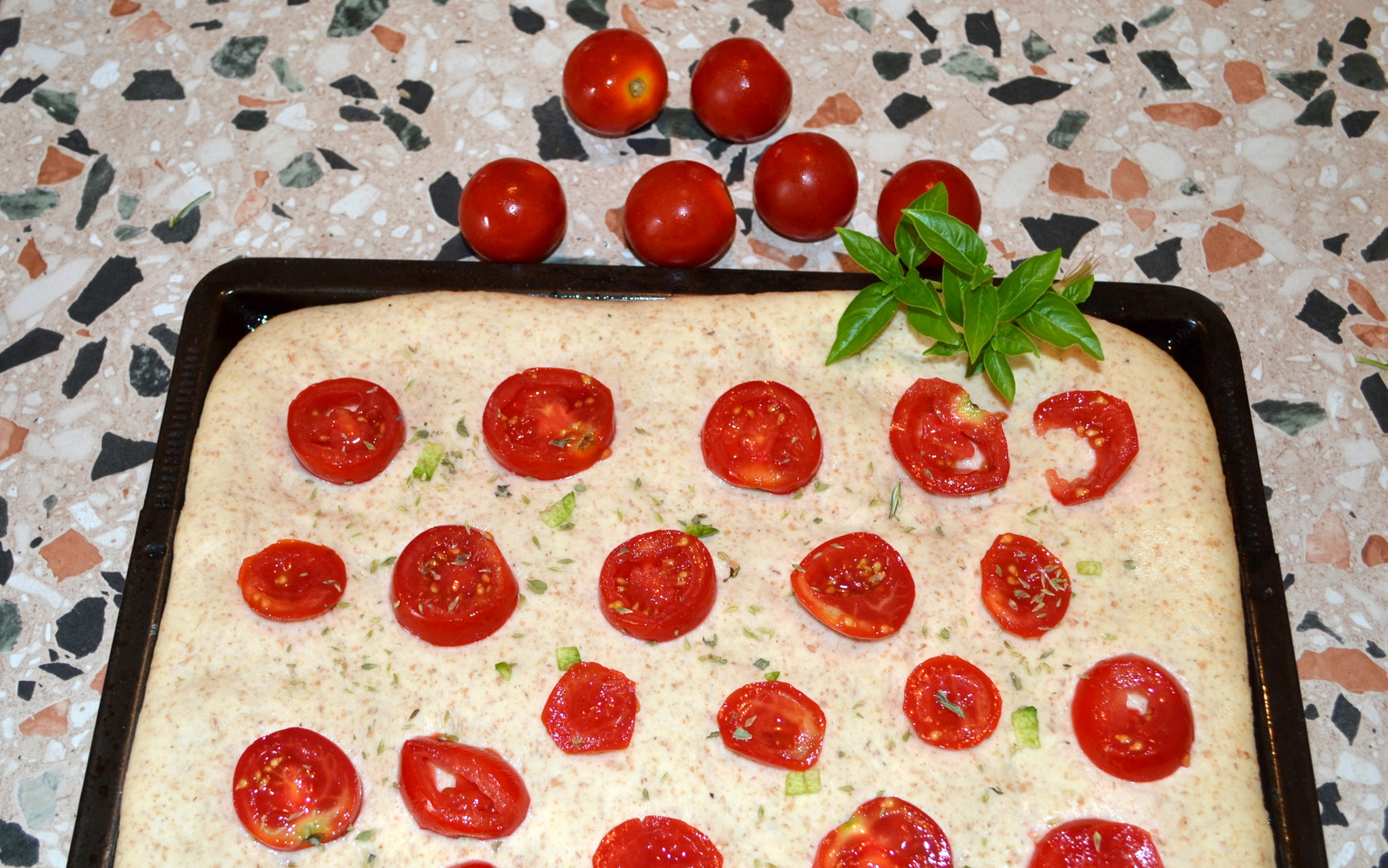 Prima di cuocerle, condite con pomodorini, origano, aglio e formaggio grattugiato. A piacere, potete condire una delle pizze, con olio evo, rosmarino e finocchietti, come quella mostrata nella foto.