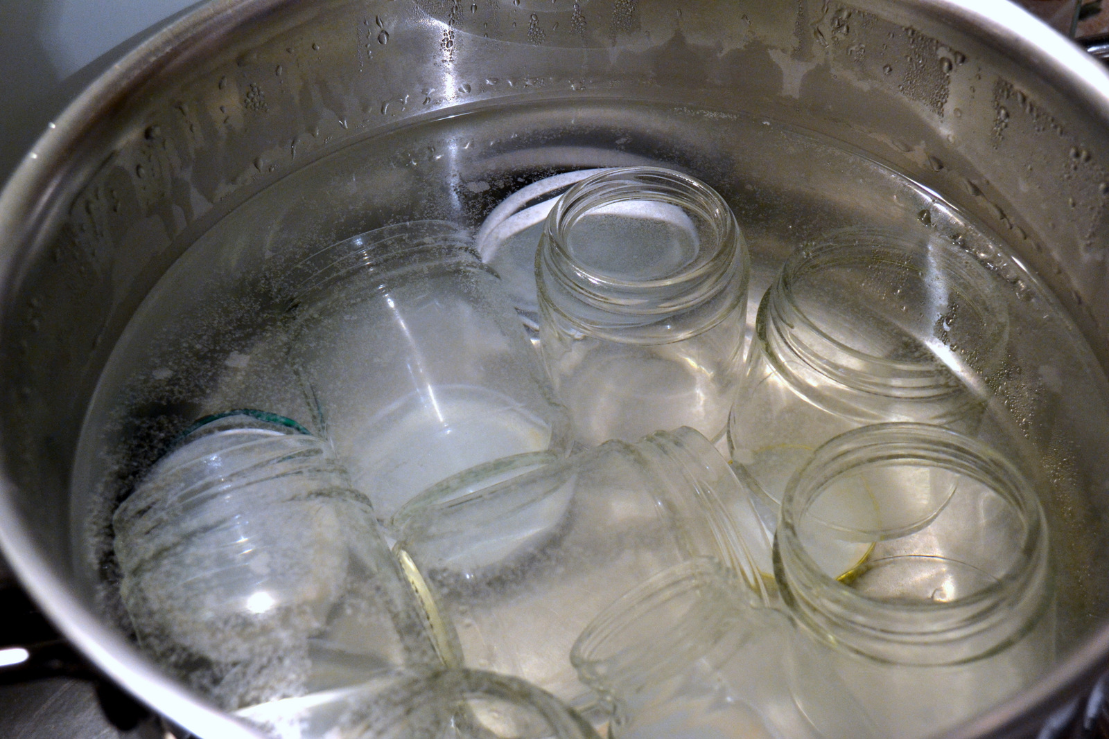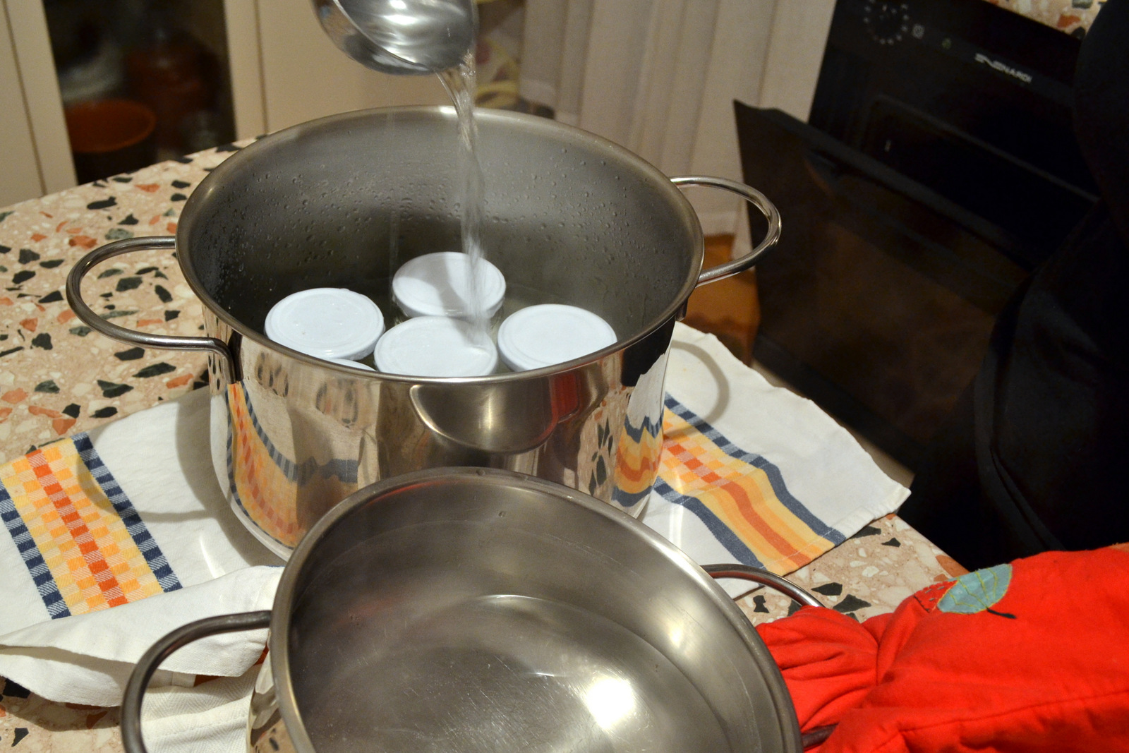 Pour hot water slowly, taking care to keep its level 2 cm below the jars lids (so this will allow to create the vacuum).