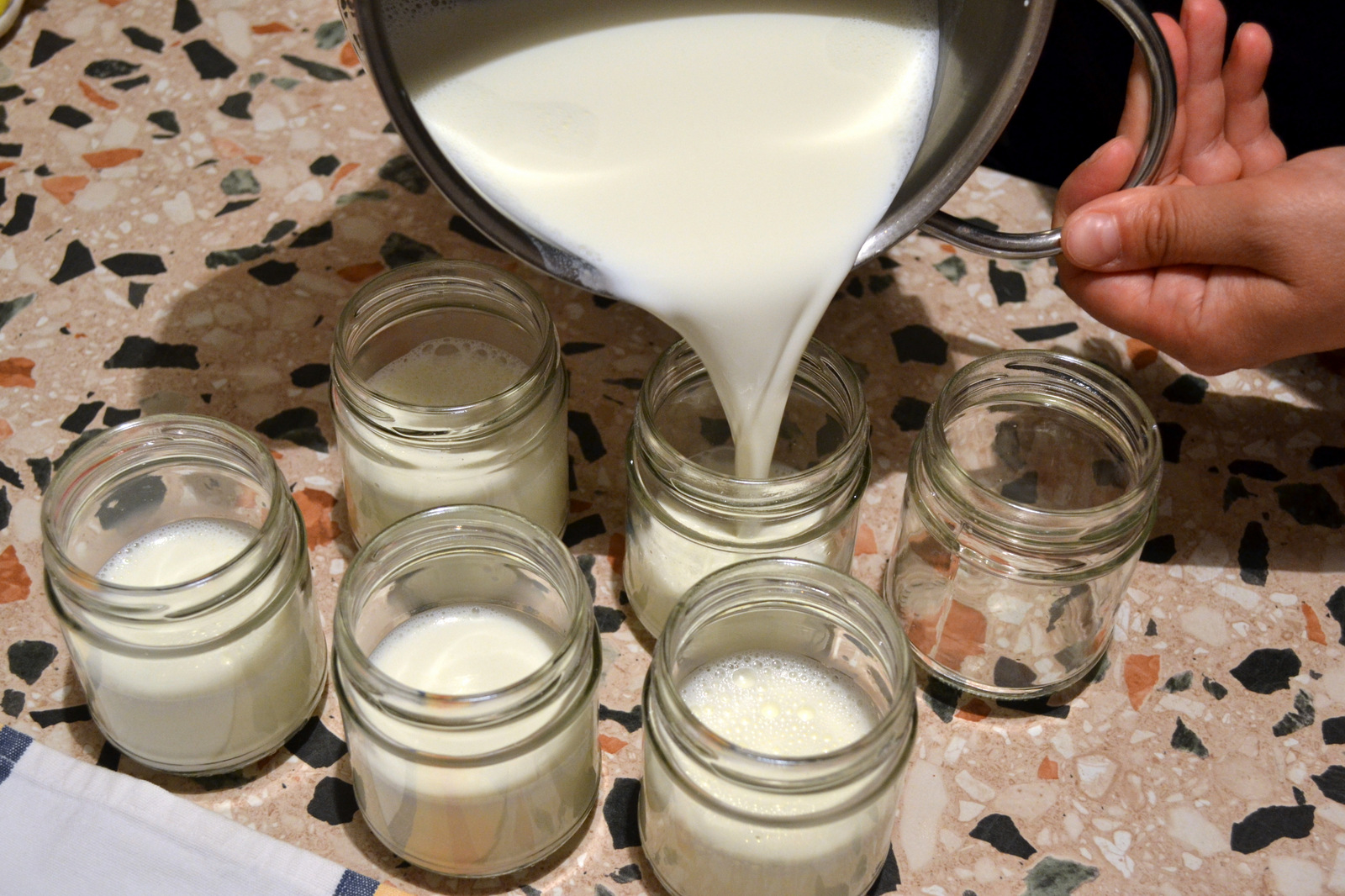 When the temperature of milk will be decreased at about 40°C, add the yogurt and stir very carefully and slowly, so the enzymes are perfectly and evenly distribuited. Fill sterilized and dried jars, close with its lids and place them in large and suitable pot.