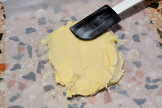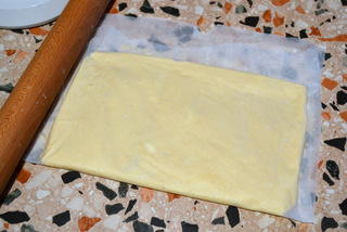 stendete il burro su un foglio di carta forno, coprite anche la parte superiore e con il matterello lavorate fino ad ottenere la forma rettangolare; fate in modo che il rettangolo risulti 1 centimetro circa di spessore e sia 17 x 25 centimetri circa;