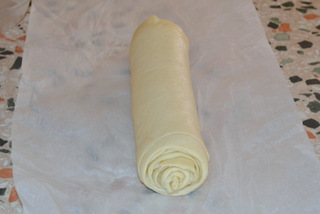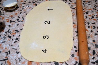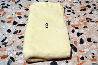 Stendete l’impasto con il matterello, cercando di fargli assumere la forma rettangolare, lavorando da destra verso sinistra e dal basso verso l’alto. Quando lo avrete steso della stessa forma e grandezza 60 x 30 circa, immaginate di nuovo il rettangolo diviso da destra a sinistra in quattro parti; ripiegate la 1 sulla 2 e la 4 sulla 3, ripiegate ancora la 3 sulla 2; fate un segno che vi ricordi che questo era il primo giro, mettete nel frigo e lasciate riposare per 30 minuti.