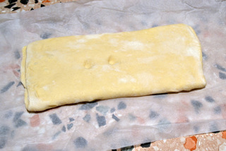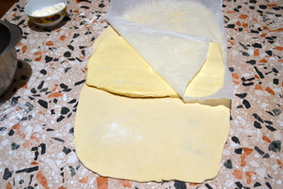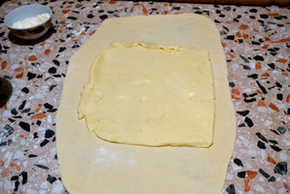 ripiegate anche parte eccedente della sfoglia superiore e quella inferiore; quando il panetto sarà chiuso nella sfoglia da tutti i lati, ripiegate a libro, cioè la numero 4 sulla 1, come mostrato nelle foto.