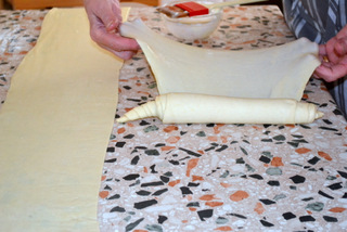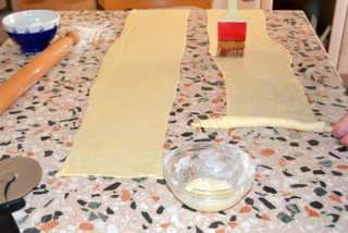 Trascorso il tempo, stendete l’impasto, fino ad ottenere un rettangolo di 60 centimetri circa di lunghezza e 30 centimetri circa di larghezza,