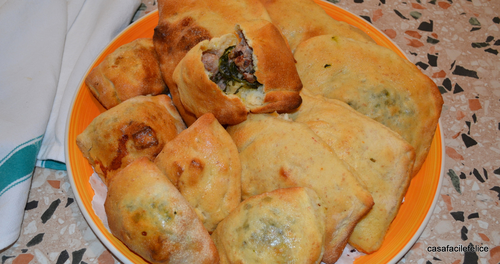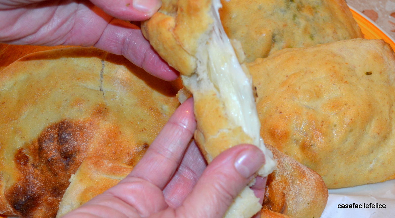 Antonietta 07/12/2013Fagottini o panzerotti ripieni di scarola stufata, broccoli e salsiccia e scamorza e prosciutto cotto; cotti al forno per 20 minuti, dorati e friabili, ma anche morbidi, se li preferite, basta spennellare un pochino di olio d’oliva sulla superficie. L’impasto si può stendere con le mani, oppure si può usare il matterello, dipende dalla vostra … pazienza.