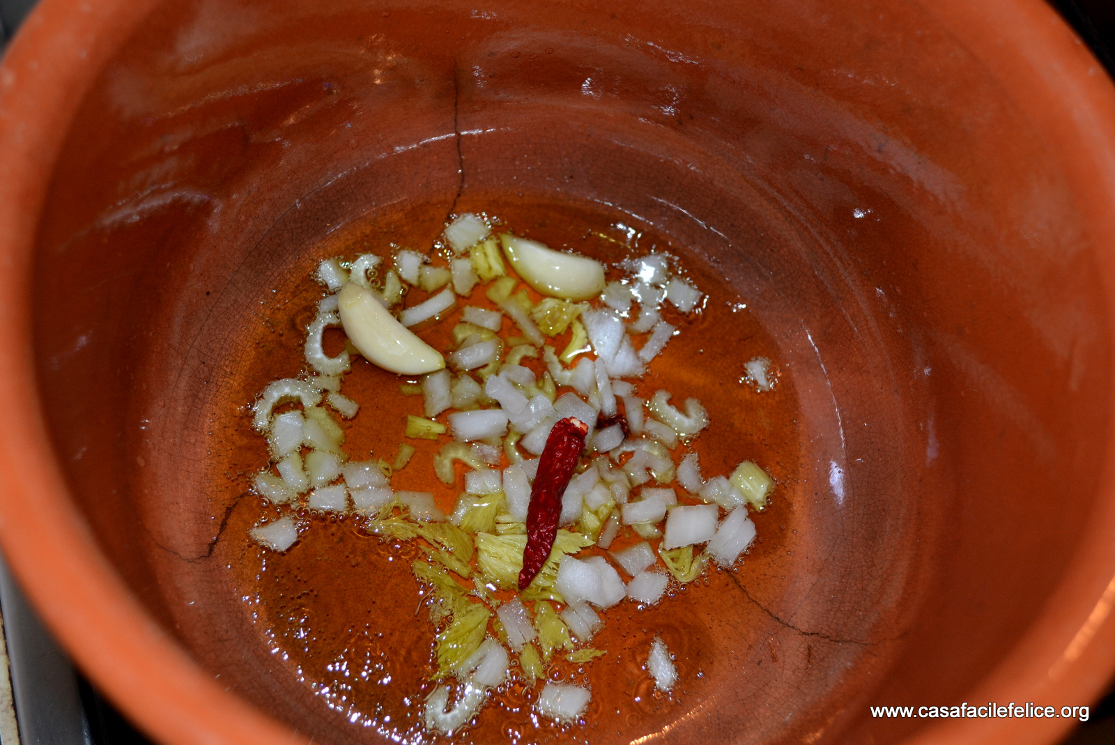 Intanto, mettete la pentola sul fuoco, aggiungete l’olio, il sedano e la cipolla tritati, l’aglio schiacciato e il peperoncino; lasciate soffriggere lentamente poi aggiungete i fagioli (se usate fagioli in scatola, scolateli dal loro brodo).