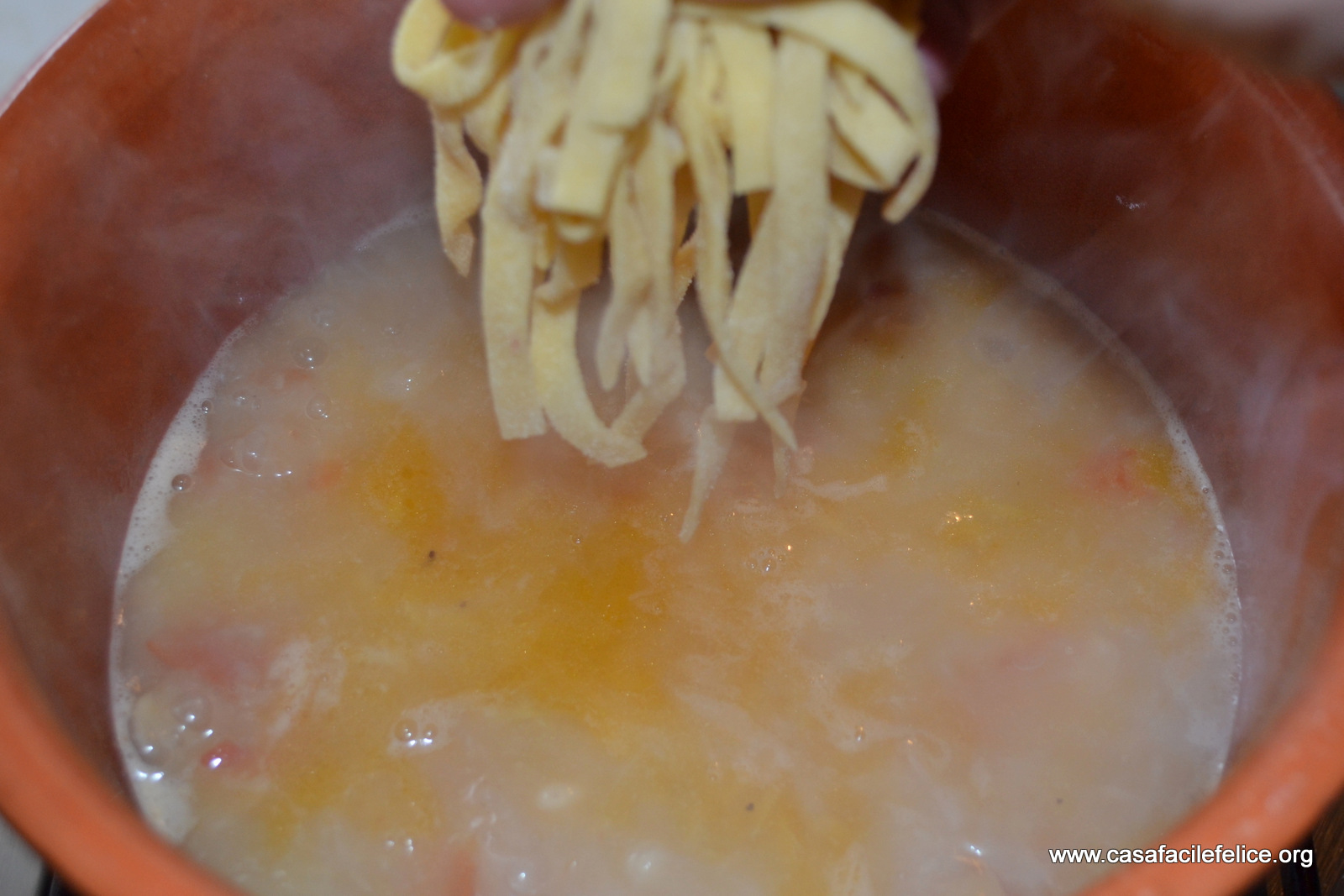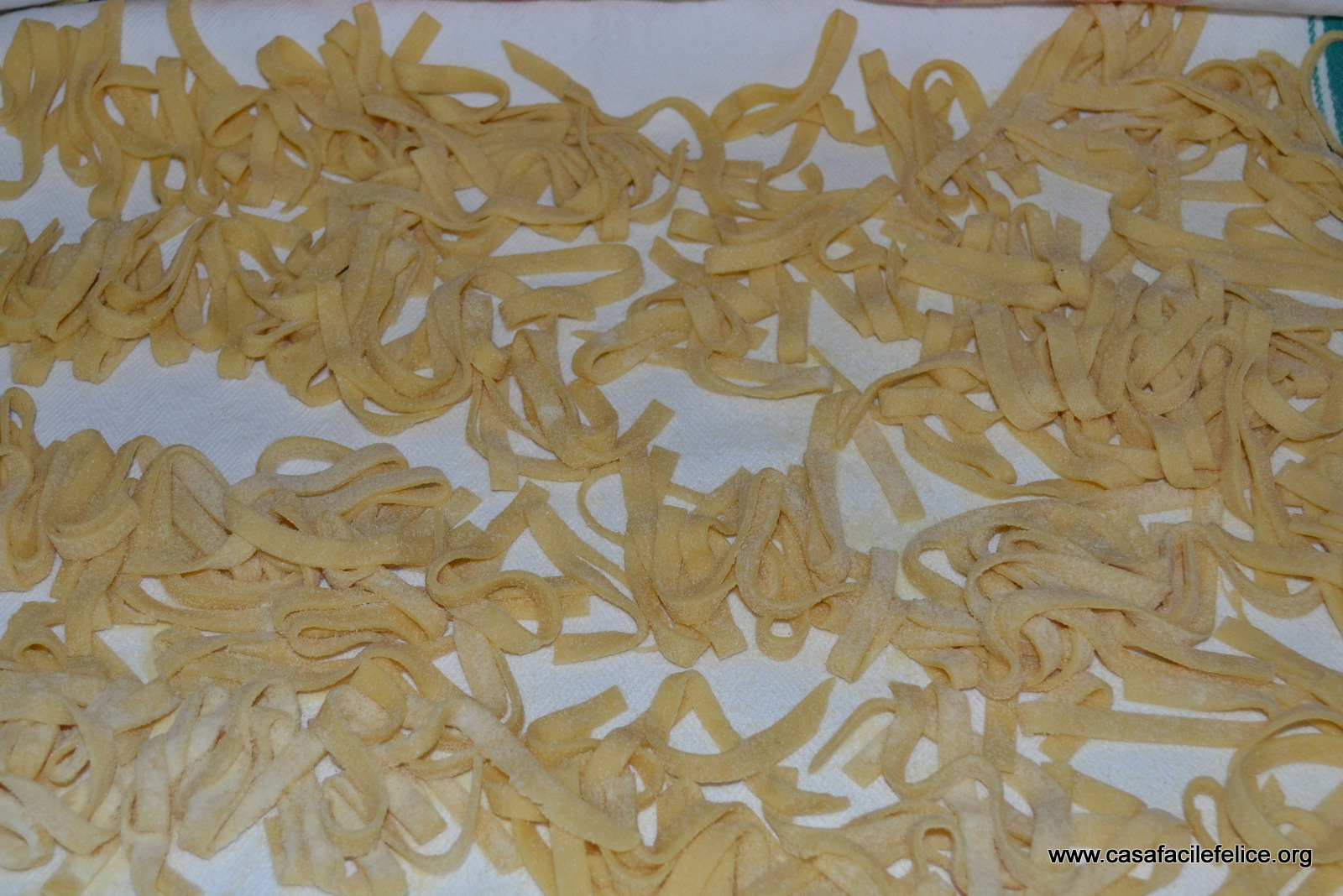 Stendete l’impasto in sfoglia non troppo sottile, se lo fate con la macchina per fare la pasta, stendetela tra i rulli al numero 5 su 7 totali; ritagliate in tagliatelle lunghe 10 – 15 centimetri (a piacere) e lasciatele asciugare fino al momento di cuocerle.