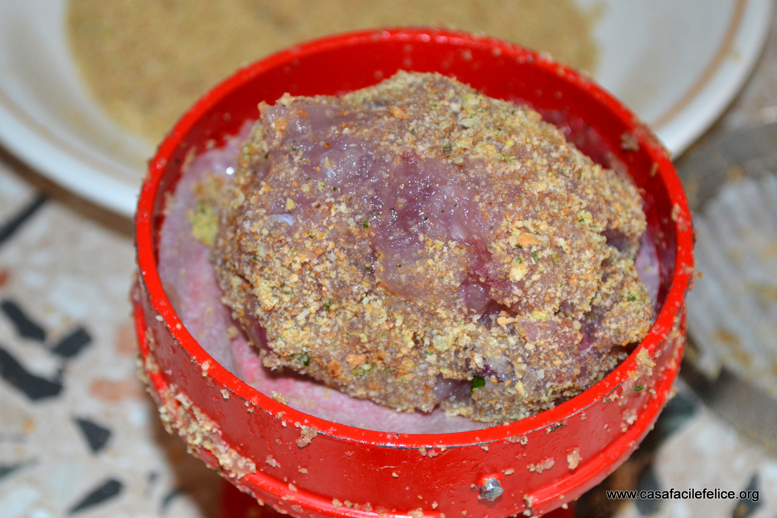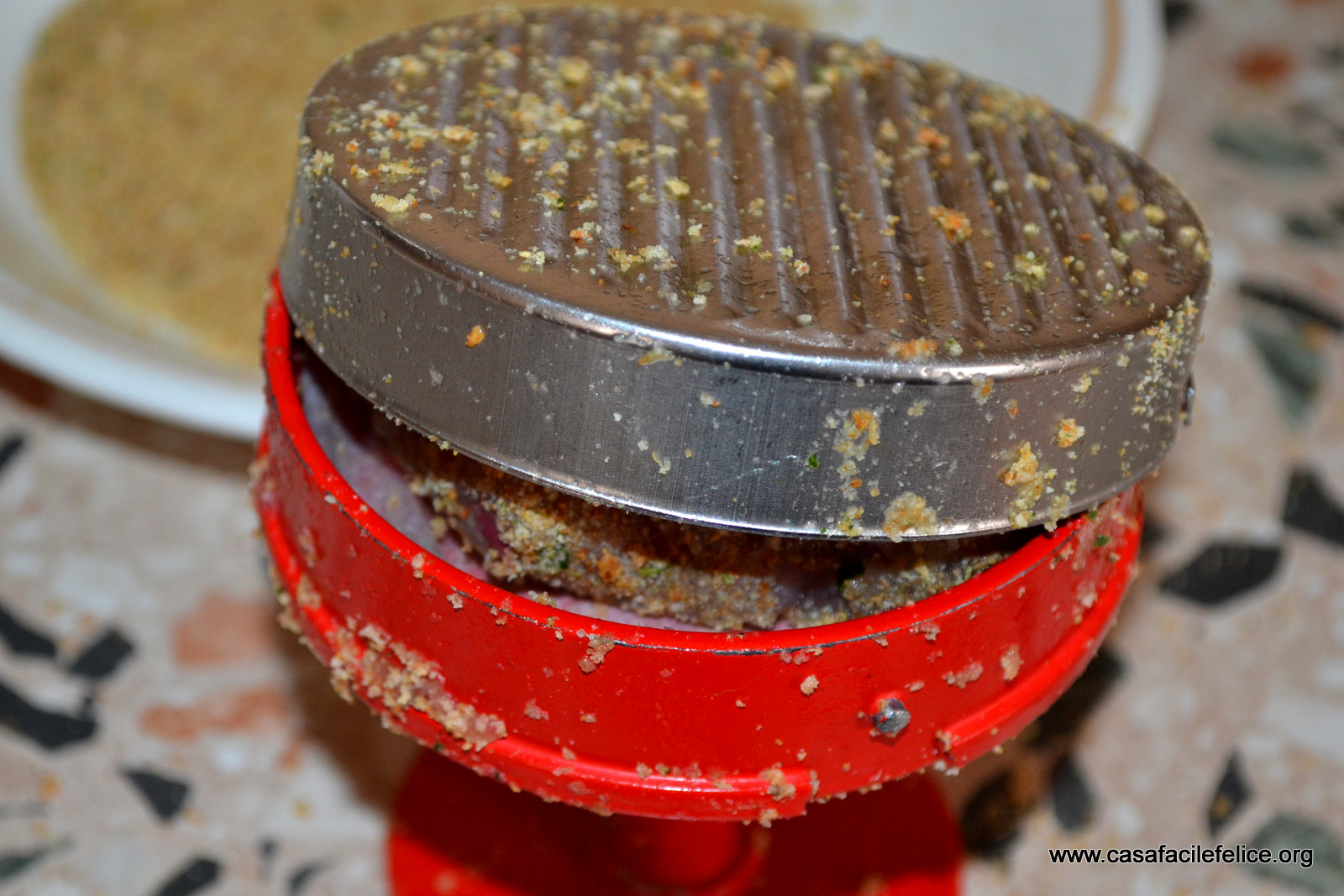 Prendete una cucchiaiata abbondante di pesce e passatela nel pane grattuggiato condito; mettete la polpetta nell’attrezzo per fare gli hamburger, chiudete e schiacciate bene, per compattare il pesce.
