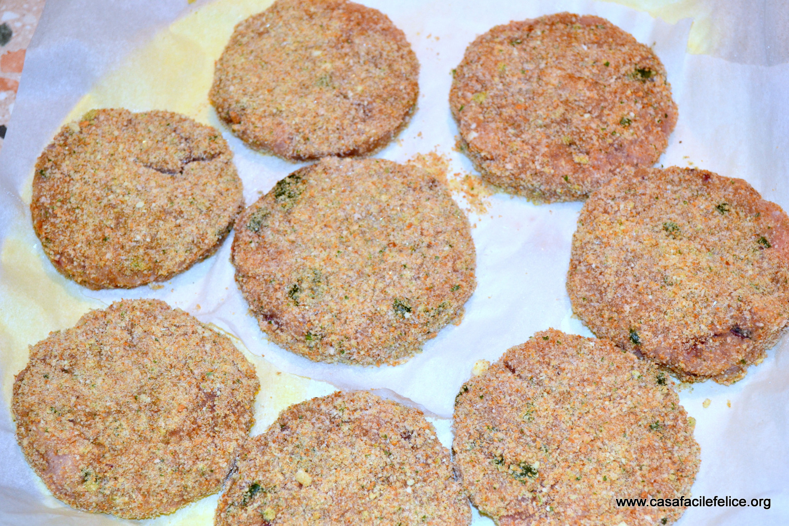 Quando li avrete fatti tutti, passateli di nuovo nel pane grattugiato condito; quelli che volete congelare, metteteli su un vassoio e riponete nel frizer;