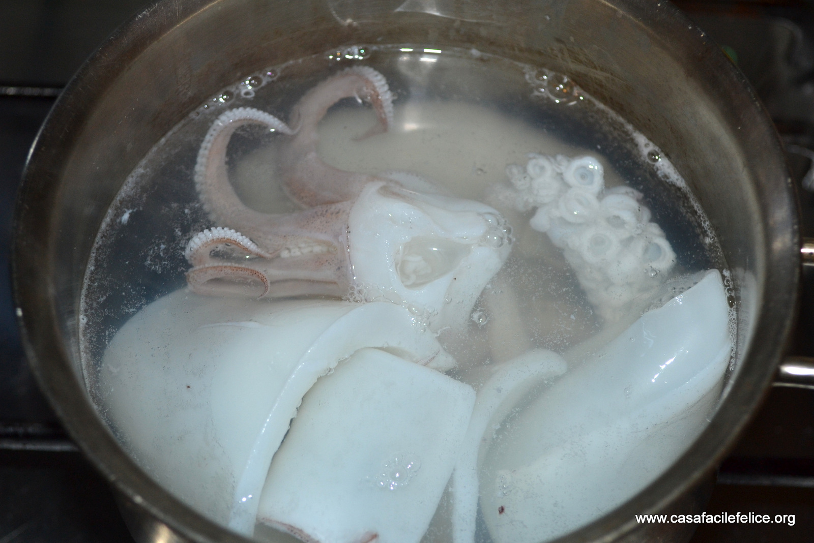 Lessate per 5 minuti il calamaro, pulito e lavato in acqua corrente, fatelo raffreddare e tritatelo con prezzemolo, aglio e peperoncino o pepe.